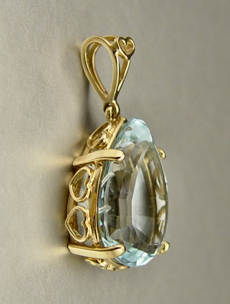 14K 10.00 CT. TOPAZ PENDANT: 14K yellow gold pendant contains one pear shaped fantasy cut topaz. Weight: 10.00 Ct. Approx. Sky blue in color. Weight: 9.5 grams.