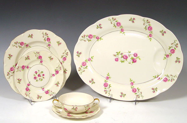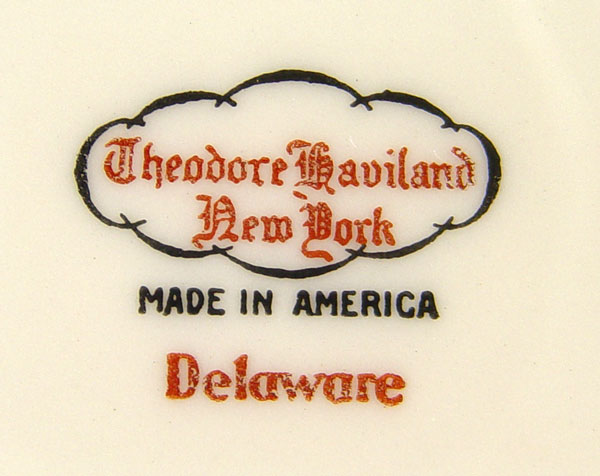 THEODORE HAVILAND NEW YORK DELAWARE CHINA: Partial service to include 8 dinner plates, 8 salad plates, 2 bread, 4 cups, 10 saucers, 1 soup bowl, 2 dessert bowls, 2 cream soups an 9 saucers. The 3 platters with wells are 11 1/2'', 15'' and 16 1/2''.