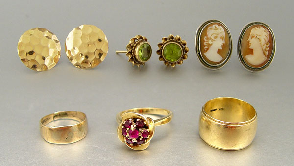 LOT OF 14K, 10K & STERLING JEWELRY: 14K gold ring with red stones. 14K gold hammered earrings. Weight: 6.3 grams. Two 10K yellow gold wedding bands and peridot earrings. Weight: 9.5 grams. Sterling cameo earrings. Weight: 3.9 grams. Sold as a lot.