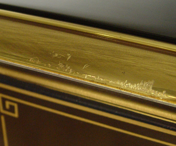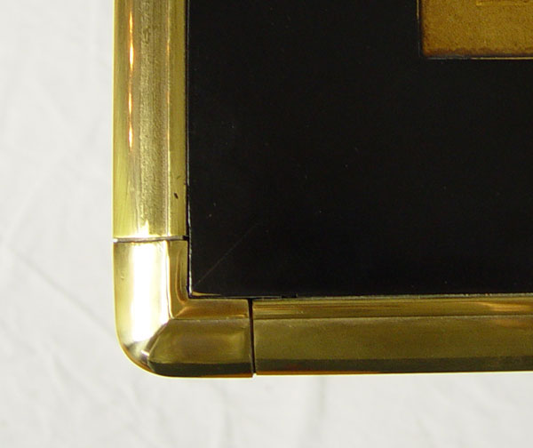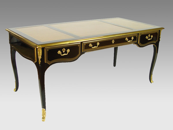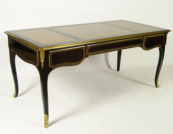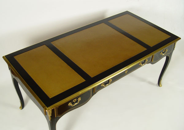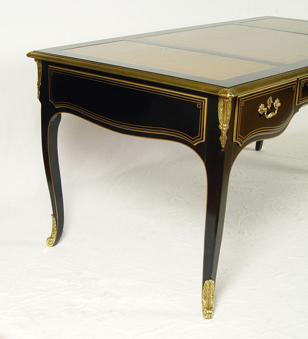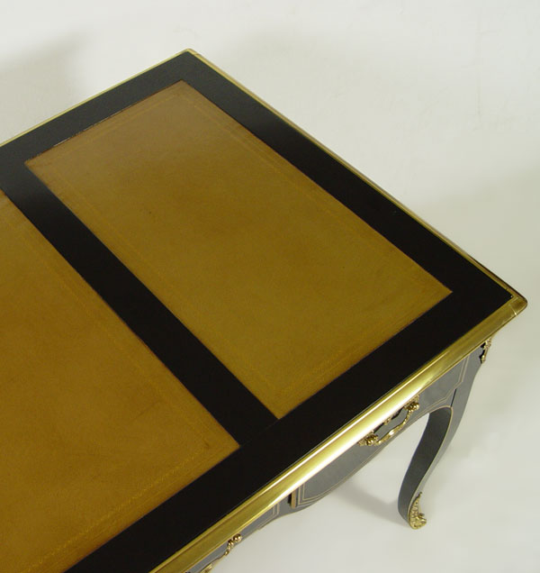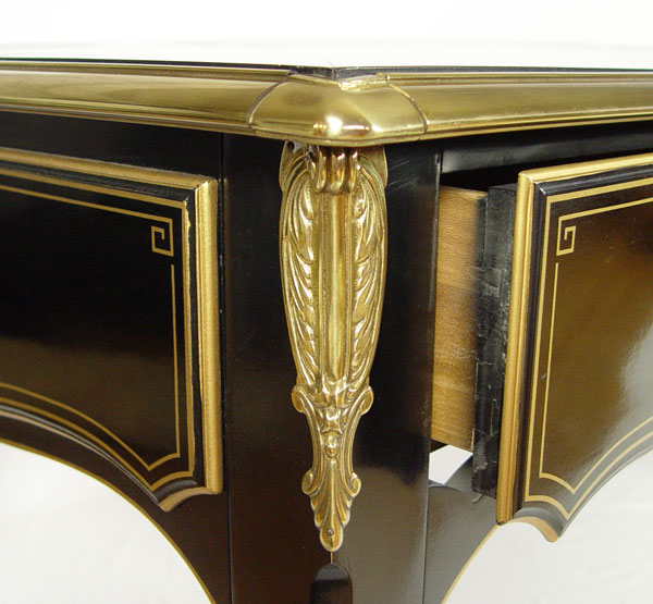 DREXEL FRENCH LACQUER EXECUTIVE DESK OUTLINED IN BRASS: Leather top, Brass trim & mounts. 3 drawers. 67'' x 33'' x 30'' tall.