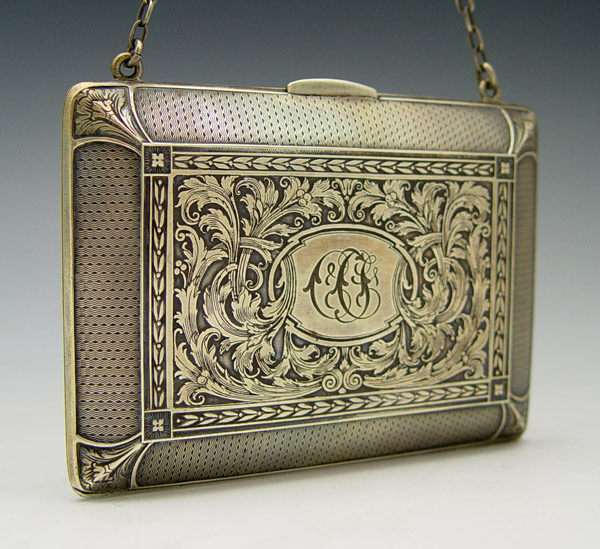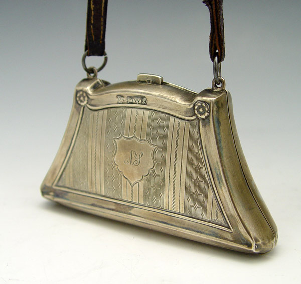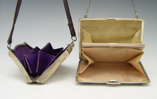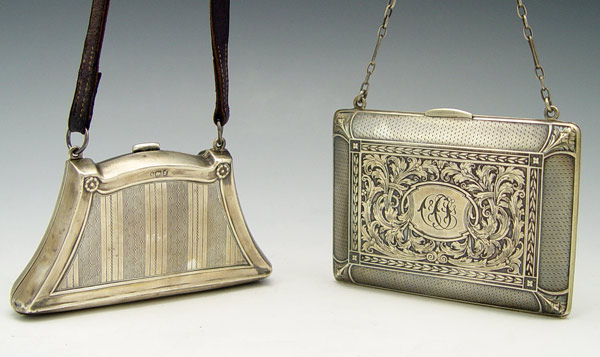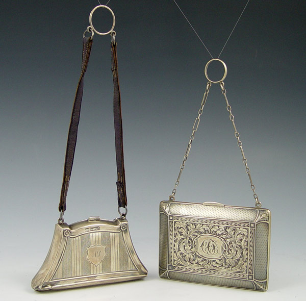 2 SILVER CHATELAINE PURSES: To include 1) James Deakin & Sons 1918 Chester England with engraved design, monogrammed N.S.. Leather strap. 2 1/4'' x 4 1/8''. 2) William B. Kerr & Co. with embossed floral decoration, monogrammed. Sterling chain. 3 7/8'' x 2 7/8''. Approx. 6 troy oz.