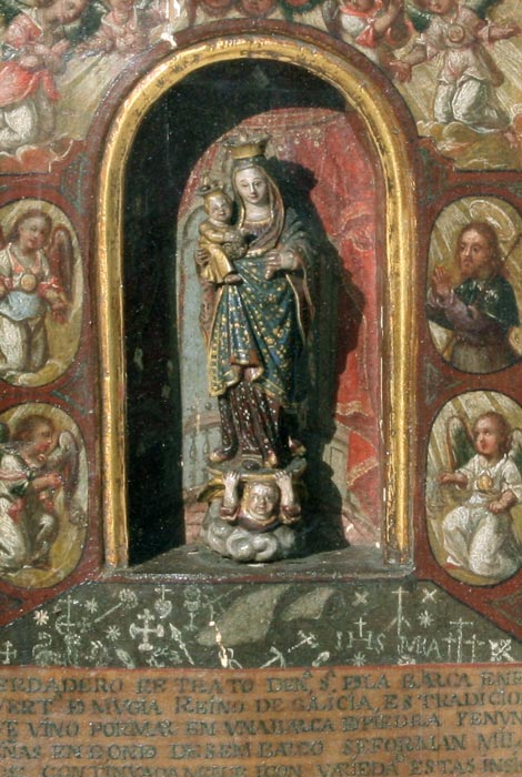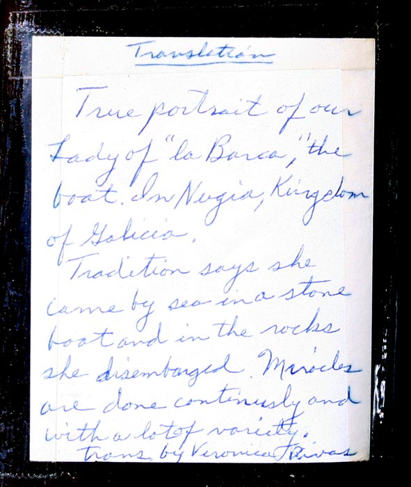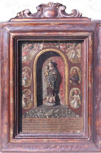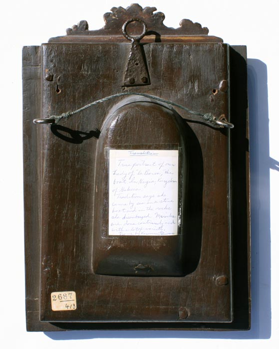EARLY RELIQUARY LADY OF THE BOAT: Carved and painted, Carved figure is 4 1/2'', overall painted surface 8 1/2'' x 6, gessoed, carved and painted 14'' x 9 1/2''.