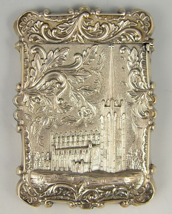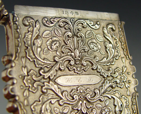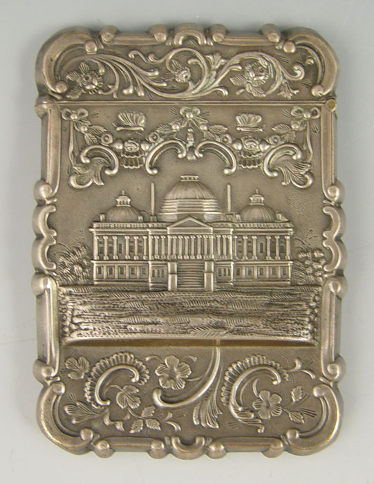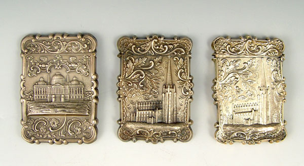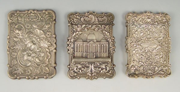 GROUP OF 3 STERLING CARD CASES: To include 1) Embossed floral design with Boston US Customs building. Monogrammed M. A. Allen. Stamped L & W maker. 3 1/2'' x 2 5/8''. 2) Embossed floral design with Boston US Customs building and St. John the Divine church. No makers name. 3 1/2'' x 2 1/2''. Embossed floral design with St. John the Divine church. Monogrammed H. C. M.. Stamped 1849 interior, no makers name. 3 1/2'' x 2 1/2''. Approx 4.4 troy oz.