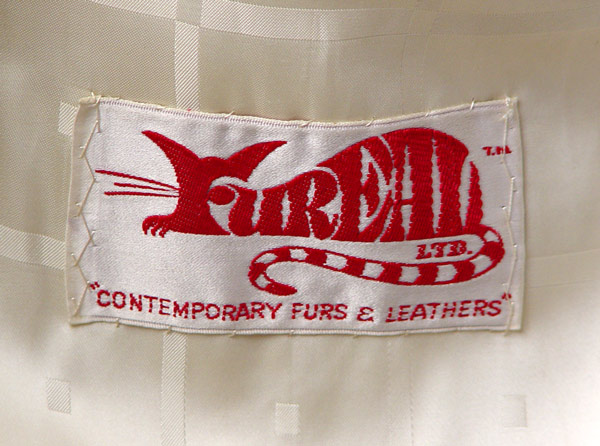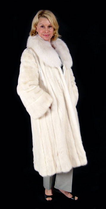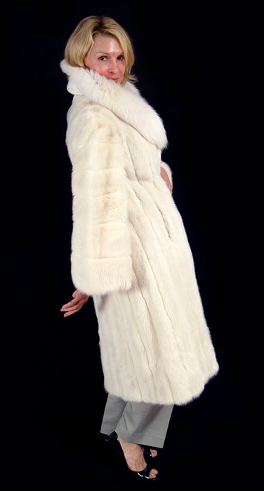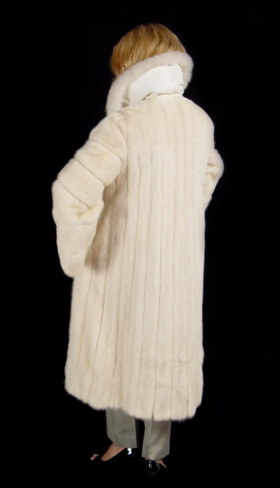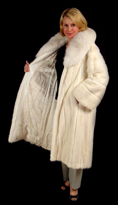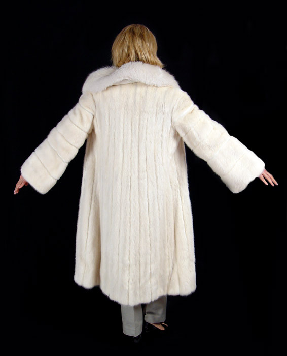 FULL LENGTH WHITE MINK COAT WITH WHITE FOX COLLAR: White leather between each strip of pelts, long flared sleeves, 44''l., 18'' shoulder width.