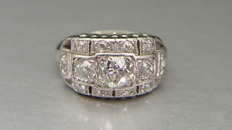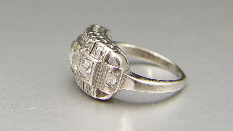 DECO PERIOD PLATINUM 1.72 CT DIAMOND RING: Ca. 1920's. Platinum diamond ring contains one old European round cut diamond. WEIGHT: .86 Ct. Approx. Rated VS1 in clarity and J in color. Twelve old mine cut, old European round cut and single cut diamonds. WEIGHT: .86 Ct. Approx. The small diamonds average VS-SI in clarity and I-J in color. The diamonds are prong set. Weight: 4.6 grams. Size: 4.5