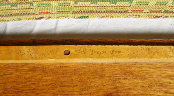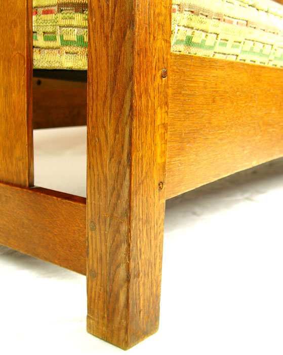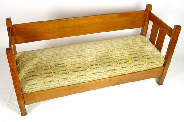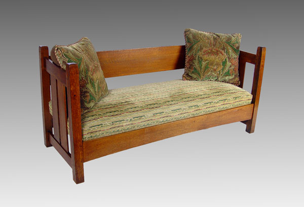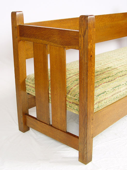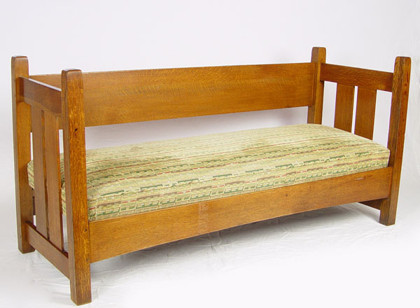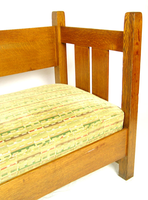 L & JG STICKLEY HANDCRAFT SHOPS OAK SETTLE 229: Arts & Crafts period oak settle. Single back splat, curved under rail. 35'' h. x 72'' x 26''. Unsigned. As seen in The Mission Furniture of L & JG Stickley, published by Turn of the Century Editions, page 134.