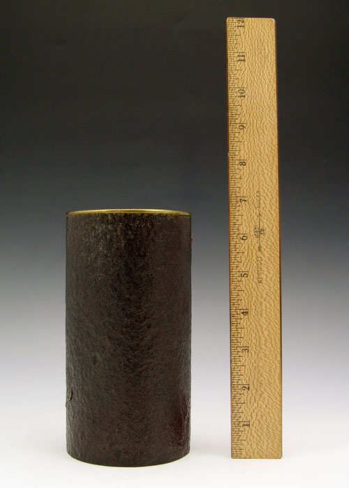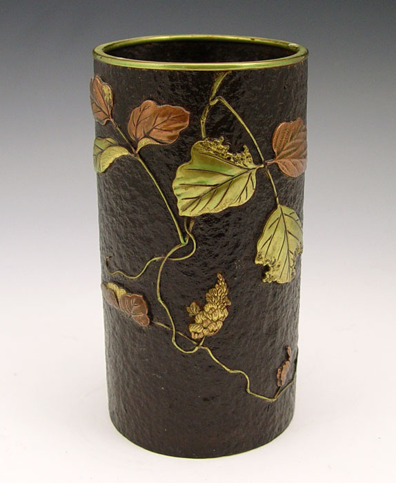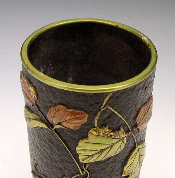 MIXED METAL CYLINDER VASE WITH APPLIED FLOWERS: Unsigned. 6 3/4'' h. x 3 1/2''