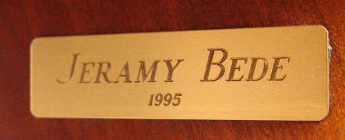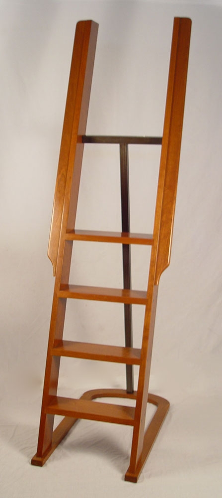 MODERN DESIGN JERAMY BEDE LIBRARY LADDER BOOKSHELF: Modern design wood bookshelf in the shape of a ladder. Metal T support. Please note rub spots and paint transfer on base. 82 1/2'' high x 20 1/2'' wide x 36'' deep.