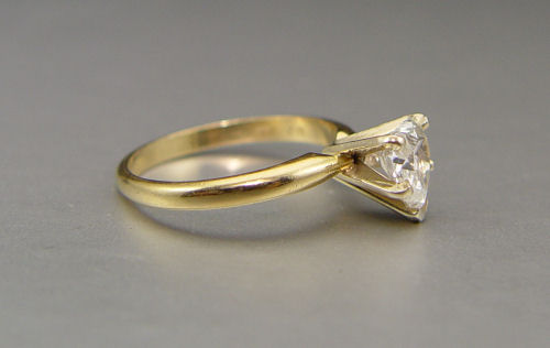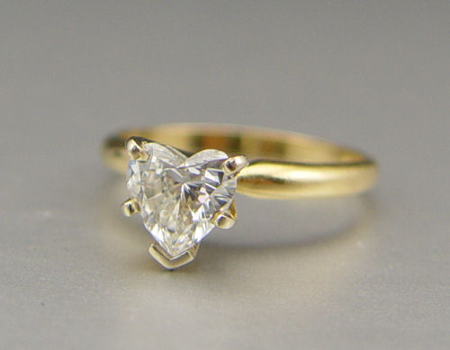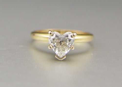 1.04 CT HEART SHAPED DIAMOND: 14K yellow gold solitaire ring contains one heart brilliant cut diamond. WEIGHT: 1.04 Ct. Approx. Rated VS1 in clarity and I in color. The diamond is prong set. Size 6.5. Weight: 2.7 grams.