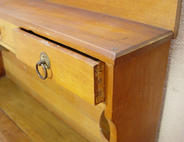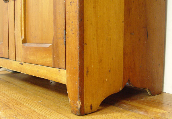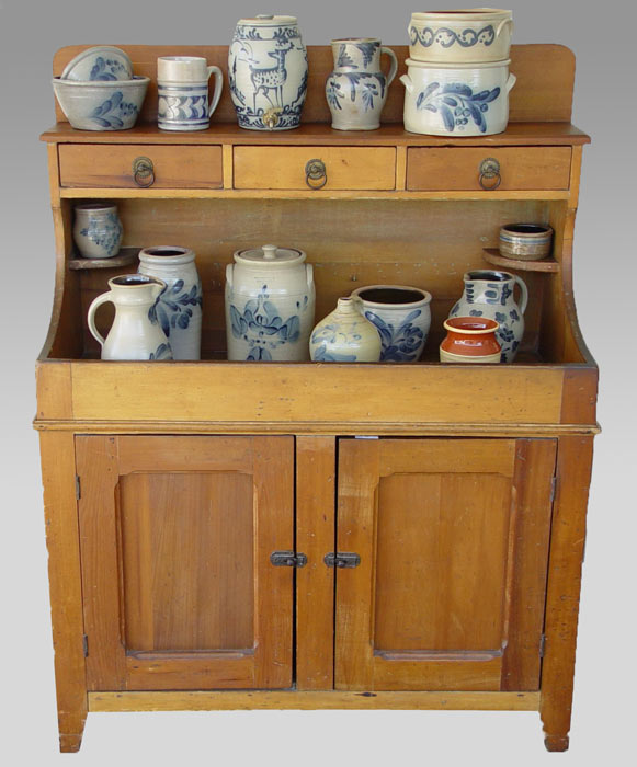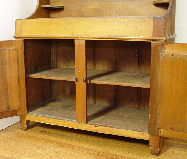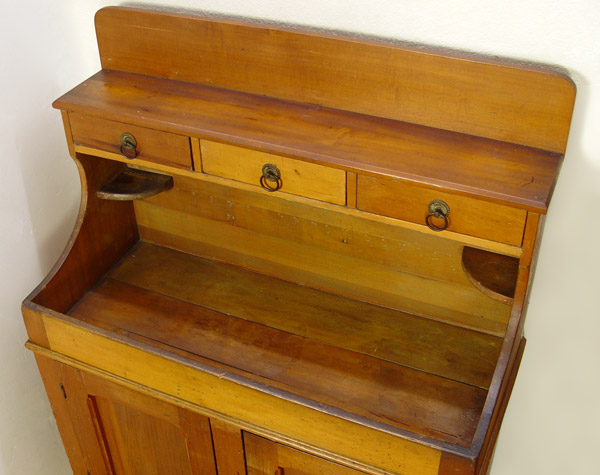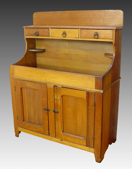 AMERICAN COUNTRY PINE DRY SINK: Pine and birch, square nail construction, upper level backsplash with three side by side dovetailed drawers and brass ring pulls. The well has with recessed panel doors, single shelf interior. Raised on bootjack ends. 54 1/2'' h. x 42 3/4'' x 19''