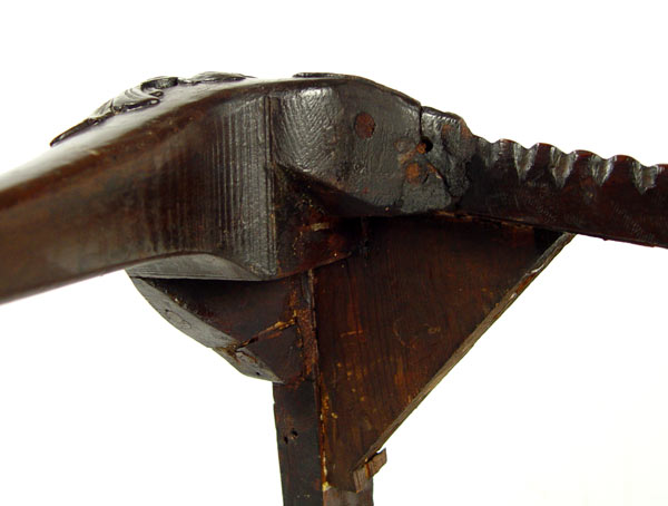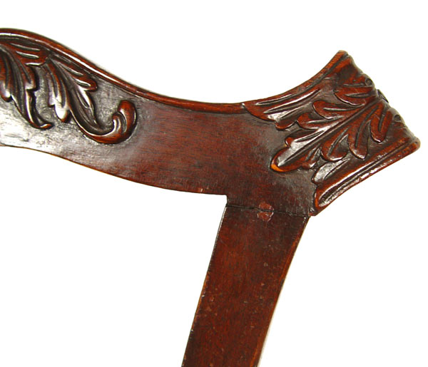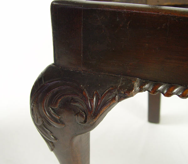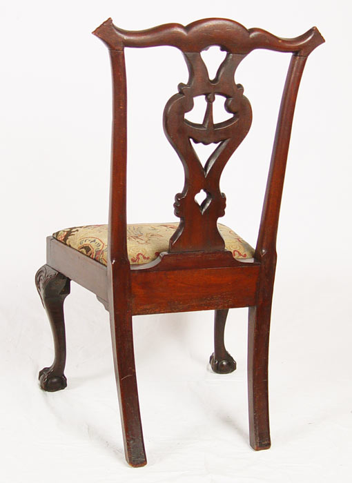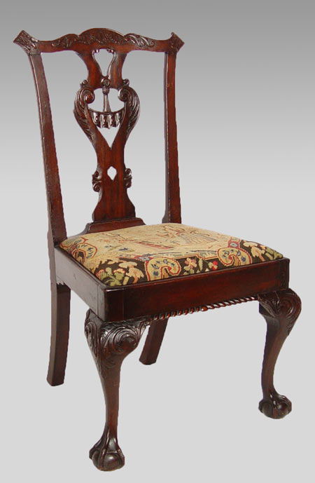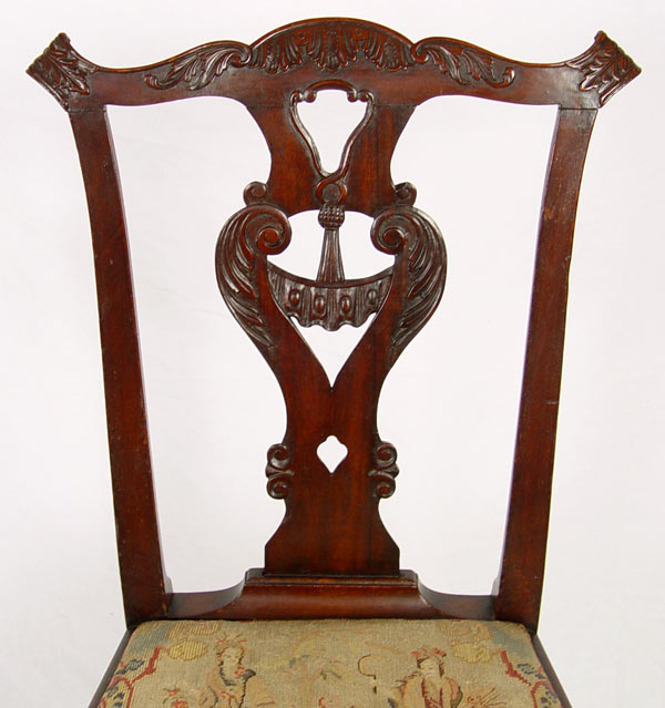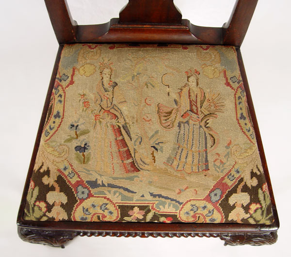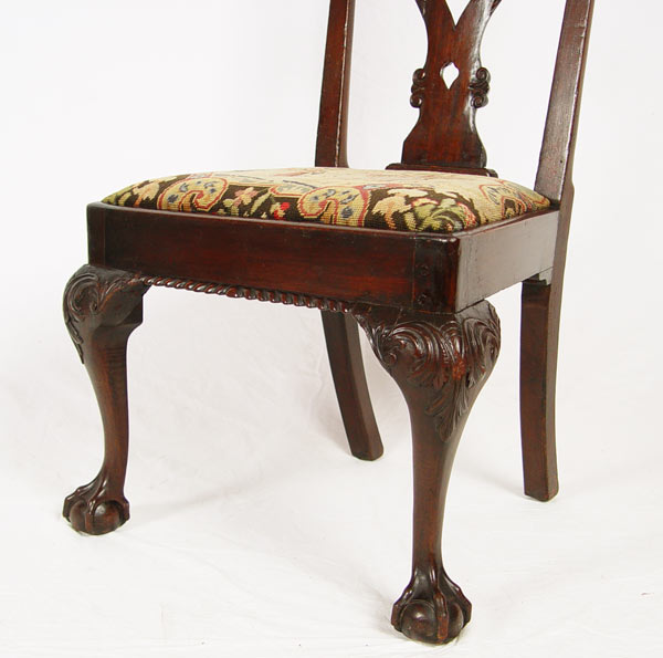 A CHIPPENDALE CARVED MAHOGANY SIDE CHAIR: Carved backsplat, garcons edging on the skirt, carved knees on the cabriole legs ending in ball and claw feet. Split seat covered in a petit and needlepoint tapestry. All peg construction. 39'' h. x 22 1/2 x 18''.
