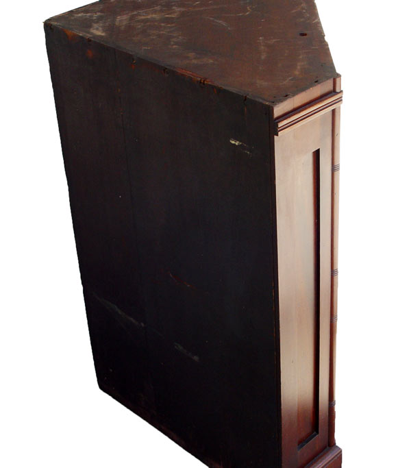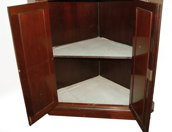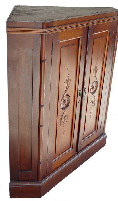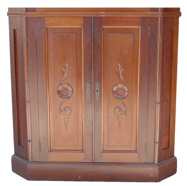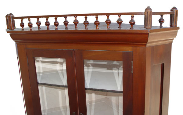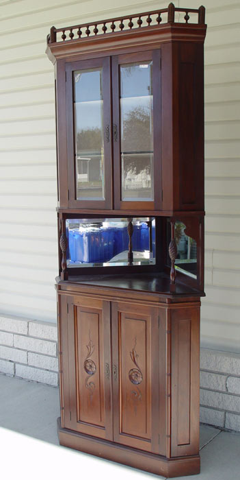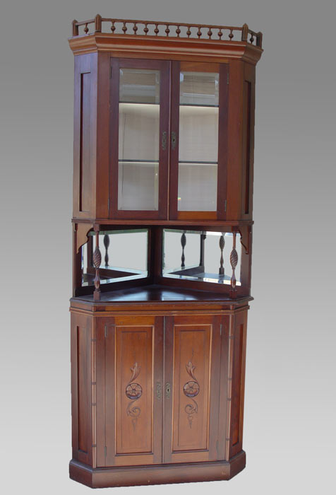 DELICATE VICTORIAN EASTLAKE STYLE CORNER CUPBOARD: Double beveled glass door top with stick and ball gallery, fitted shelf interior, lower shelf with beveled mirrored back and turned dowel upper cabinet supports, lower cabinet with carved door panels and shelf interior, 7'2'' tall, 42''w x 21''d.