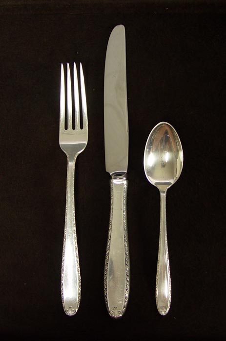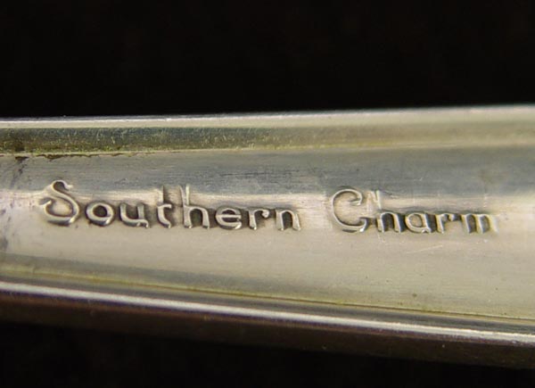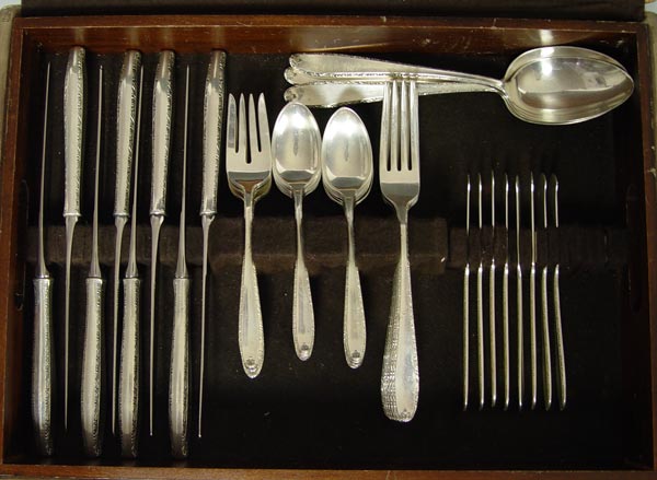 ALVIN SOUTHERN CHARM STERLING FLATWARE SET: Complete service for 8 with approx. 59 pieces in the Southern Charm pattern to include 8 forks (7 7/8''), 8 salad forks (6 1/2''), 16 teaspoons (5 7/8''), 8 hollow knives (9 1/2''), 8 solid butter knives (5 3/4''), 3 tablespoons (8 3/8''). Approx 49.9 troy oz. Sold with nice oriental motif silver chest. Measures 5 1/2'' x 16 1/4'' x 11 1/2''.