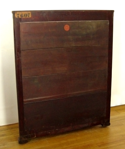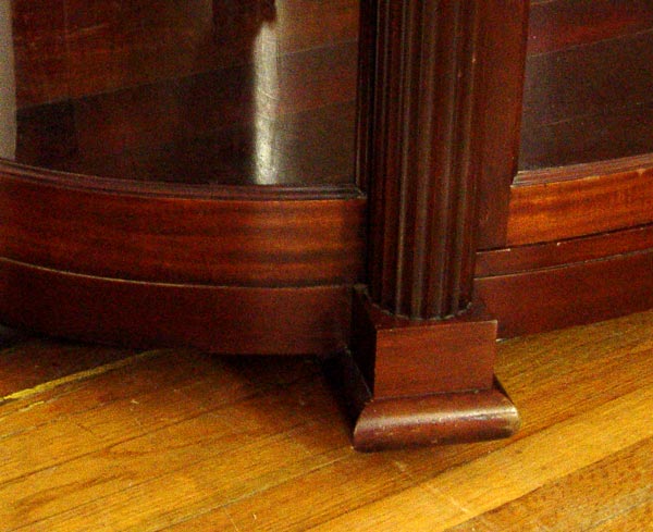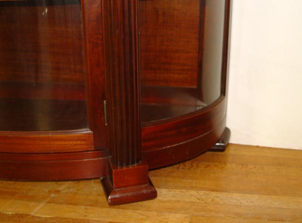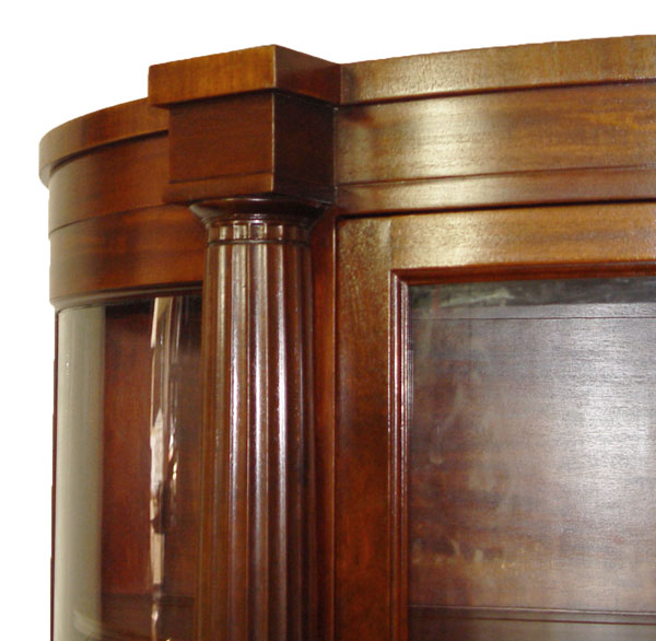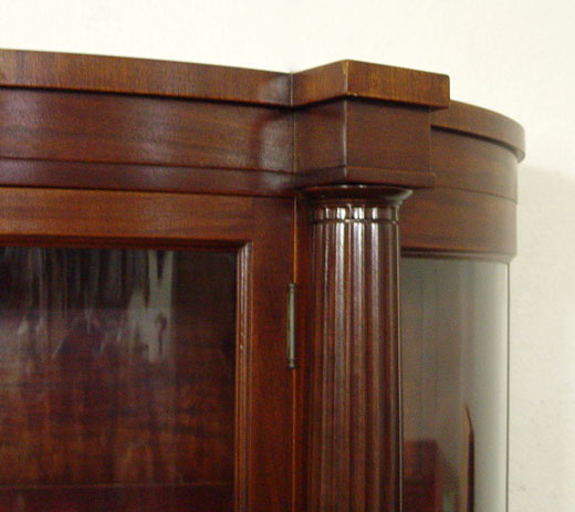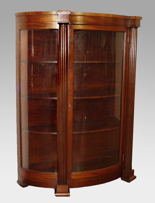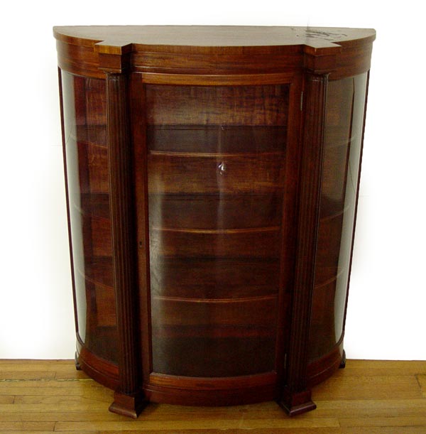 MAHOGANY TRIPLE BOW FRONT CHINA CABINET: Full length fluted columns divide the central door from the curved side panels, Block feet. Originally purchased from Hoffmier Bros. of Lancaster PA. 59'' tall x 48'' x 17''.
