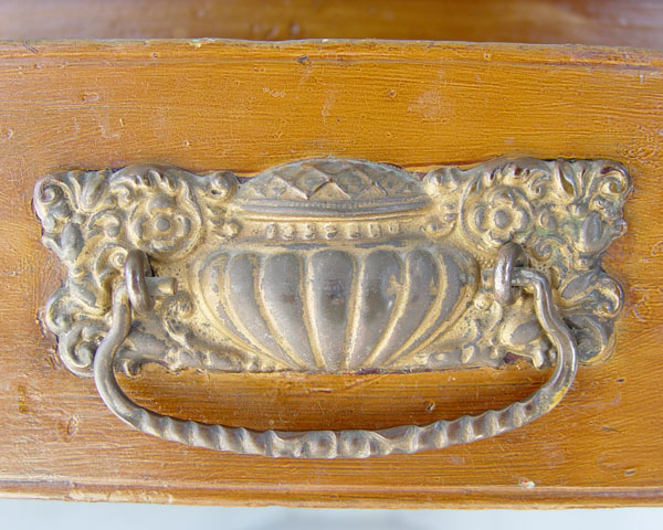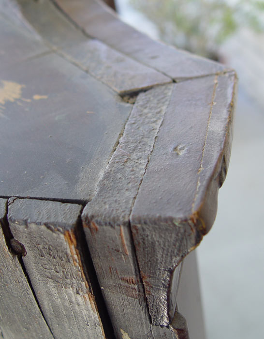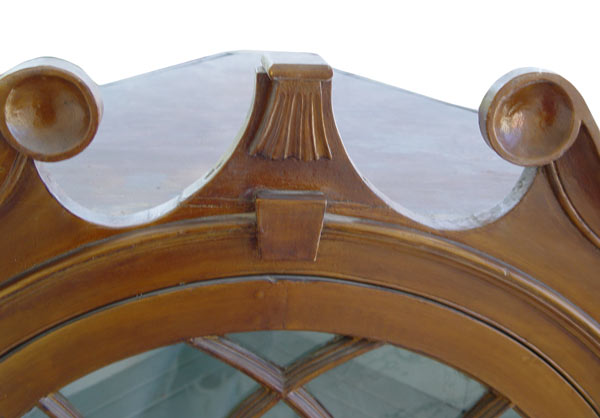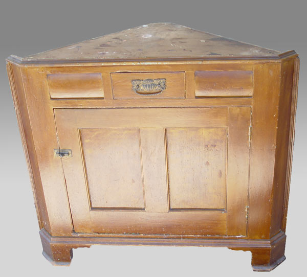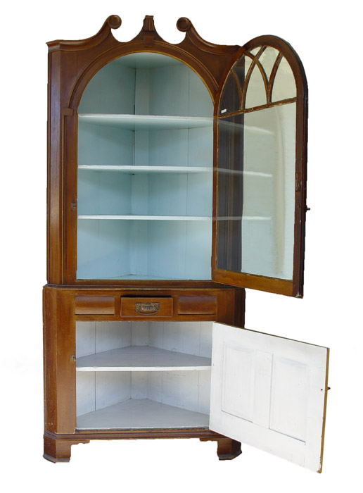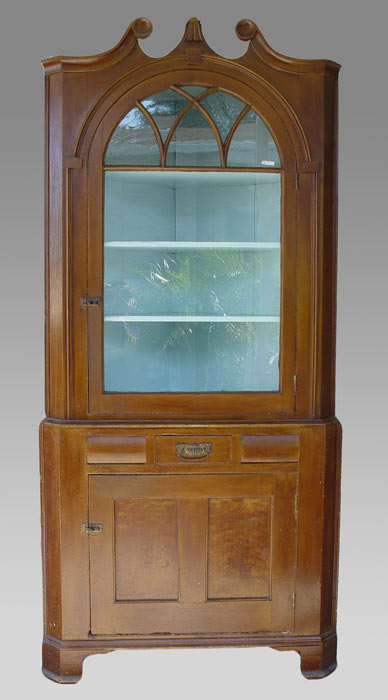 EARLY 19TH C CORNER CUPBOARD: Architectural 2 part cupboard with upper section having arched divided glass, broken arch pediment with thistle finial, painted interior. The base cabinet is of a single drawer over single door, bracket feet. There is evidence of layers of paint under the brown finish, the glass appears to be original. 92'' tall x 44'' wide x 23'' deep.