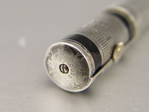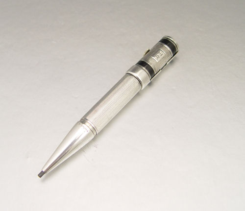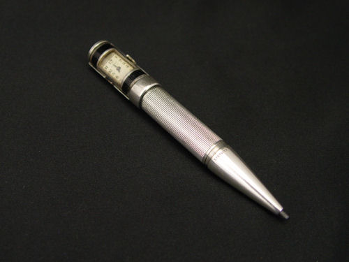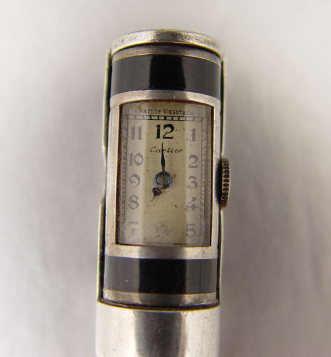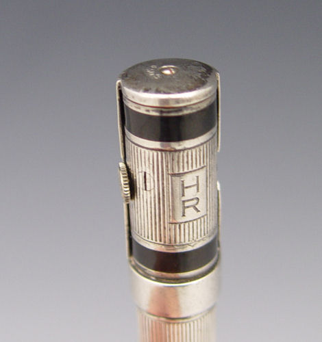 CARTIER ENAMELED STERLING PENCIL / WATCH: Art Deco mechanical sterling pencil with built in Cartier watch. Black enamel bands. Monogrammed HR. The watch is not running. 3 5/8'' length.