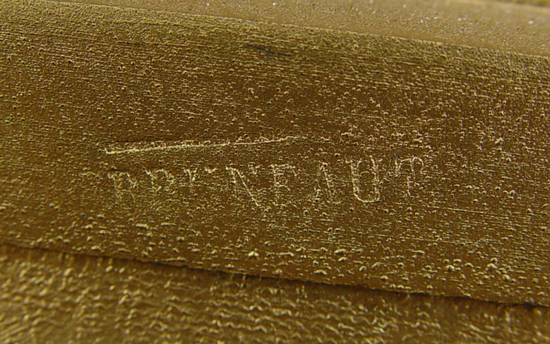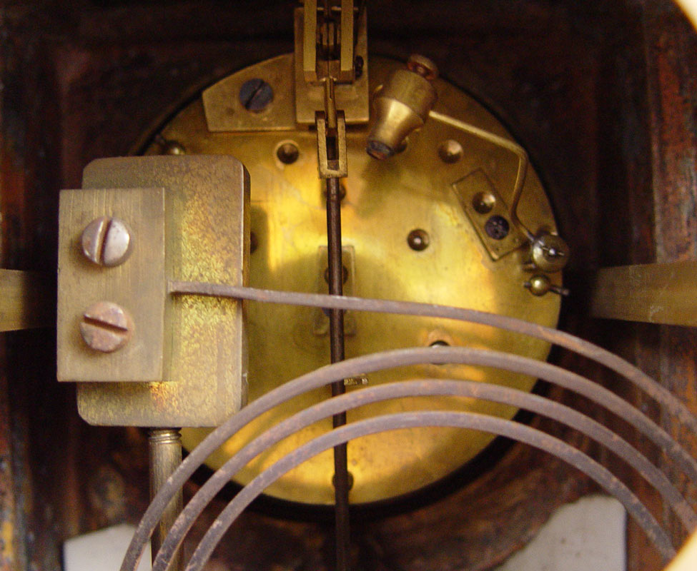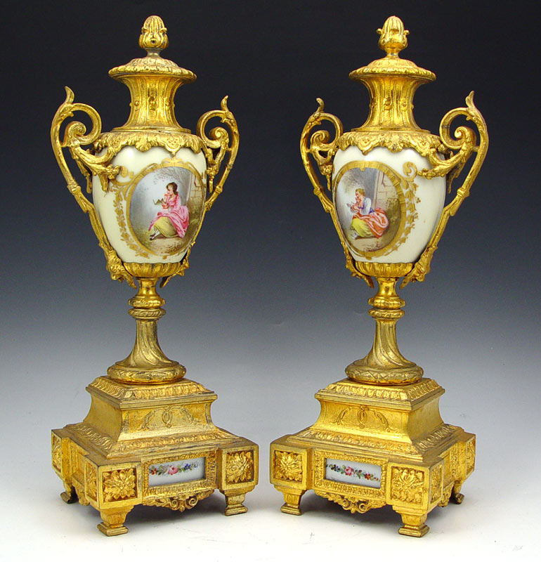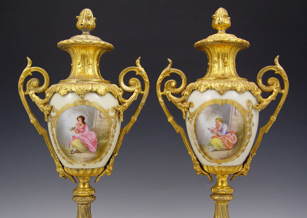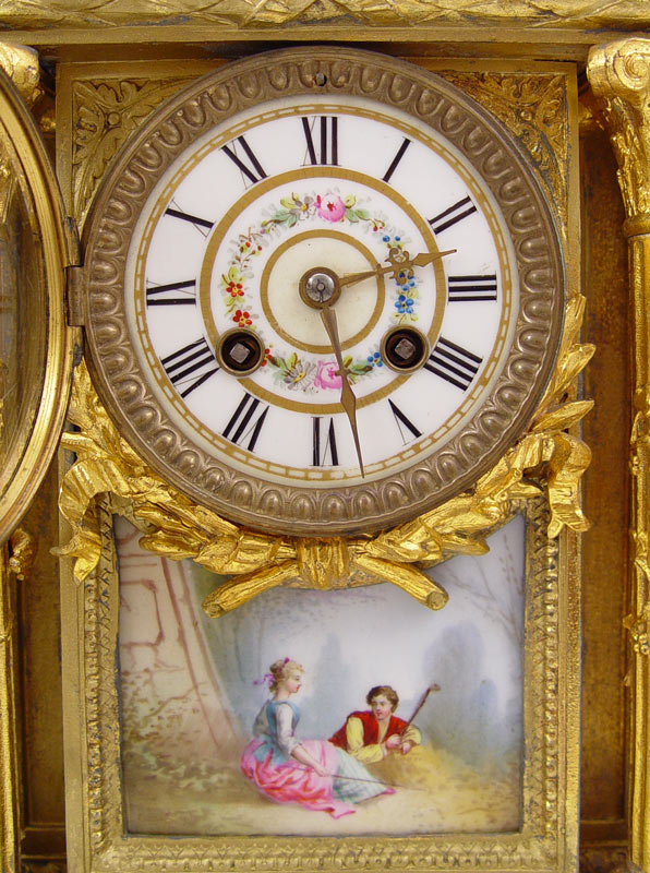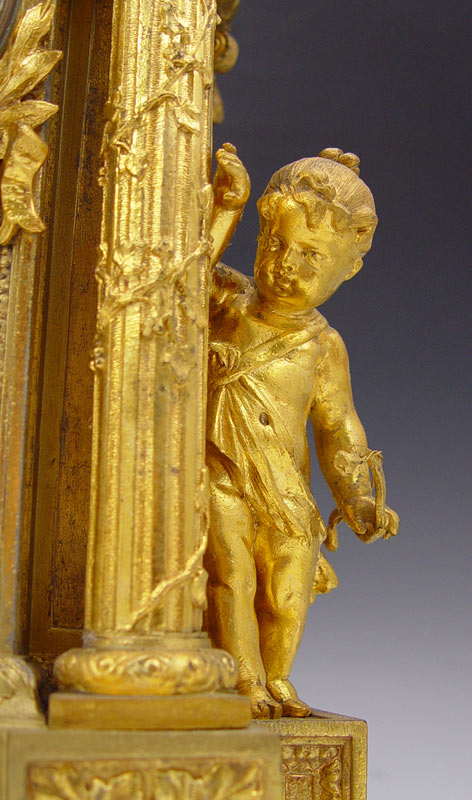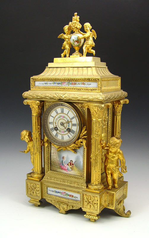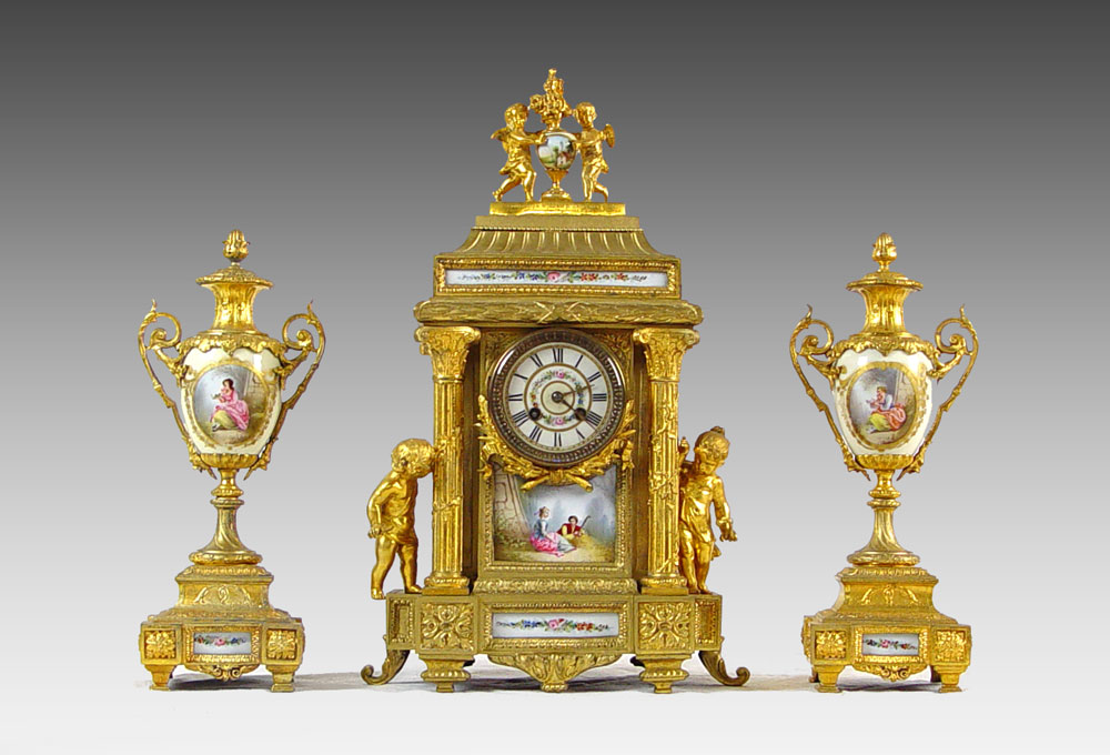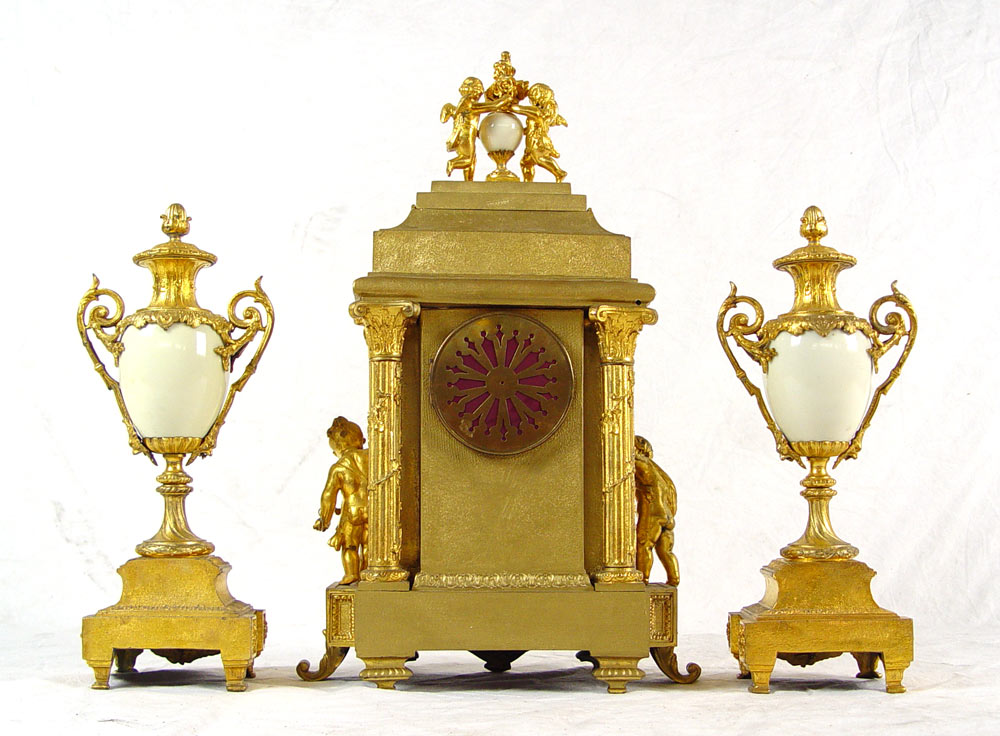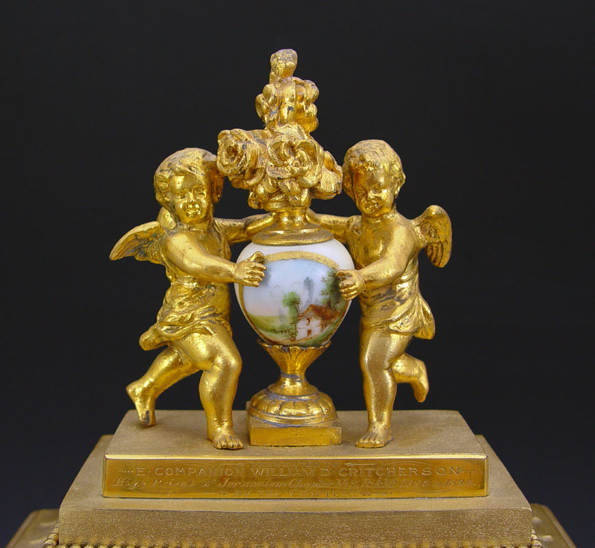 MASONIC PRESENTATION CHERUB FIGURAL CLOCK GARNITURE: Gold painted cast metal case featuring putti, cherubs, full columns. Hand painted porcelain inserts. Porcelain face with Roman numerals and hand painted decoration. Presentation plaque reads ''Presented to E. Companion William D Critcherson, High Priest of Jerusalem Chapter #8 R.A.M. (Royal Arch Masons) 1893-1894, By the Chapter''. French time & strike movement. 20 3/4'' h. x 12 3/4'' x 6 1/2''. Sold with matching urn form garniture with hand painted porcelain inserts & body. Key & pendulum in office.