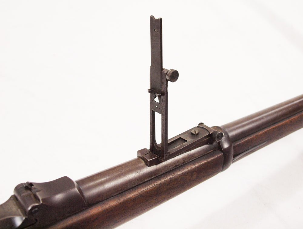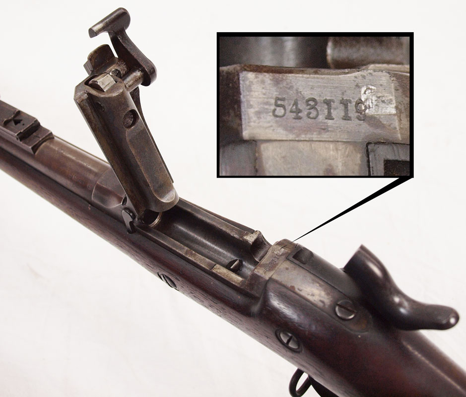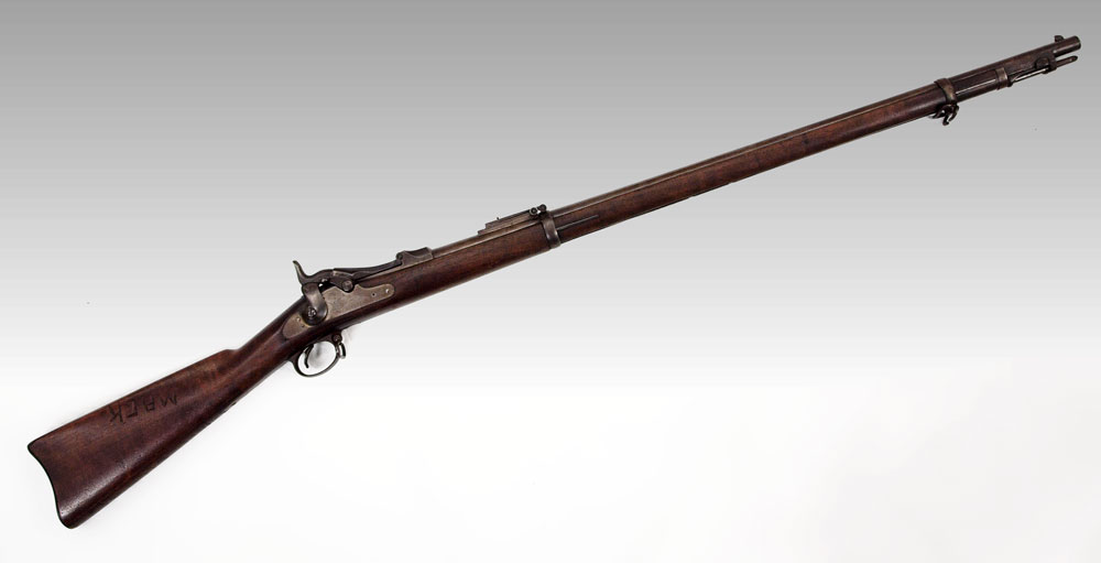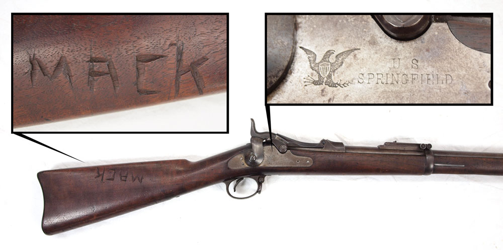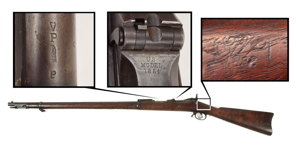 MODEL 1884 US SPRINGFIELD TRAPDOOR RIFLE: Model 1884 US Springfield 45-70 caliber. VP and eagle proof stamps on barrel, SWP 1892 cartouche and US stamp on buttplate. Buffington site. Stock overall excellent with exception of previous owners name ''Mack'' crudely inscribed. Serial number #543119. Nice plum patina to 32 1/2'' barrel. 52'' overall. Original cleaning kit in stock.