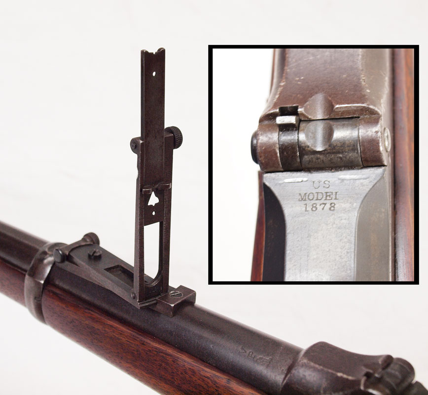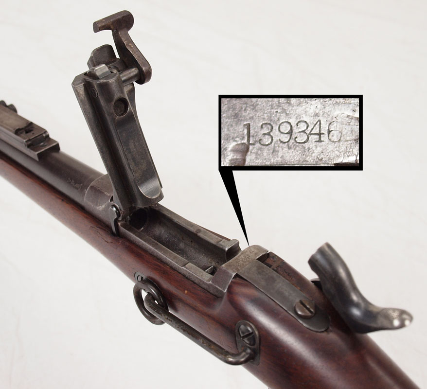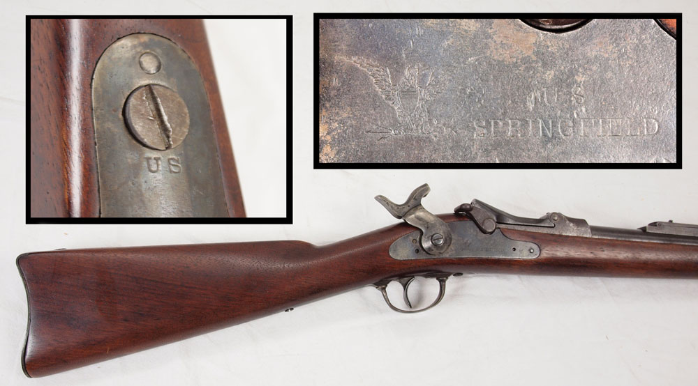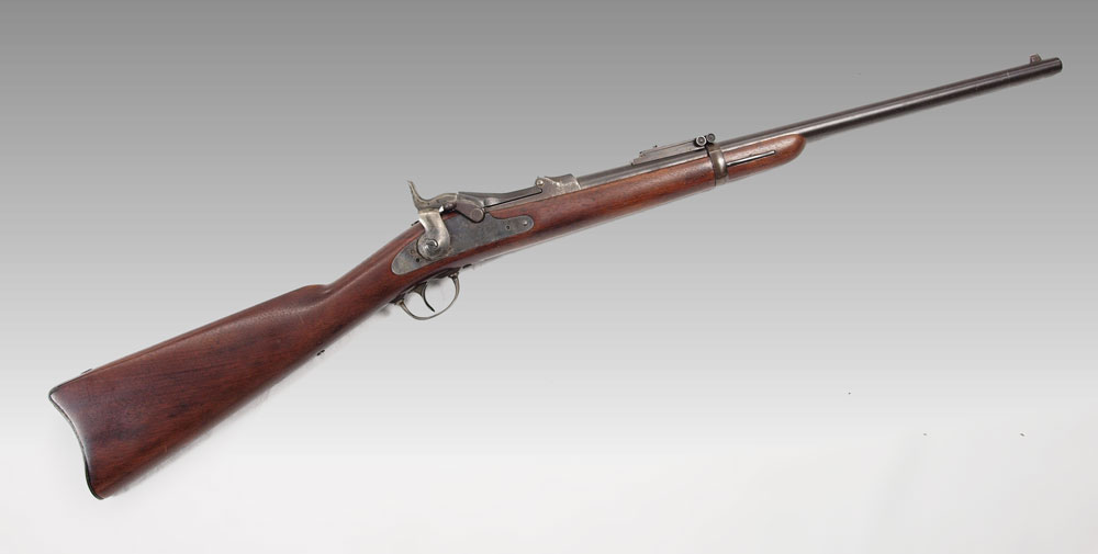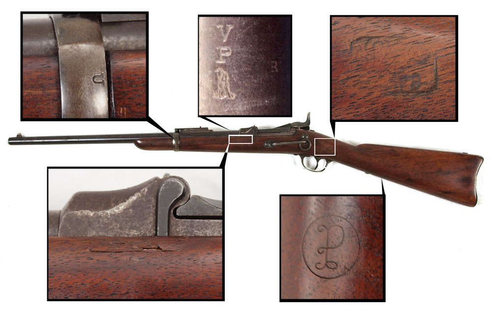 MODEL 1873 US SPRINGFIELD TRAPDOOR CARBINE: True carbine with original saddle ring. V P an eagle head proof marks, obscured SWP inspector cartouche on stock, circle P cartouche near trigger plate, US on buttplate. 45-70 caliber, 22'' barrel with nice plum patina. Stock overall excellent with the exception of one area of damage near breech. Serial number #139346. 41 3/8'' overall length. Original cleaning kit in stock.