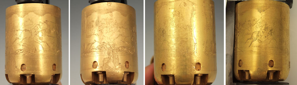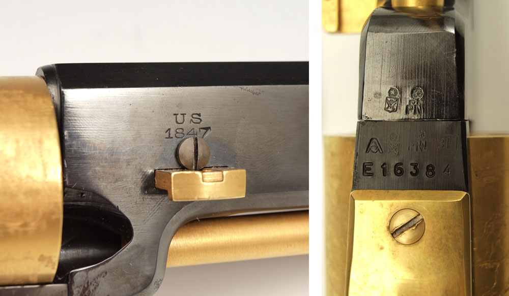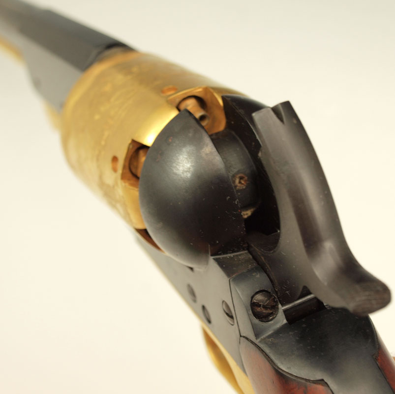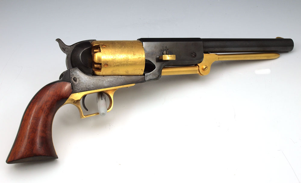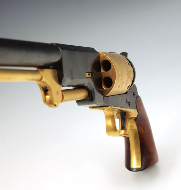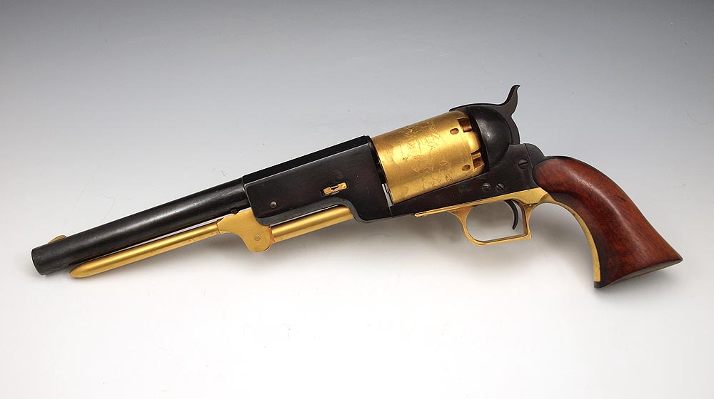 ITALIAN COLT WALKER REPLICA PERCUSSION PISTOL: Black finish with 24k gold plated cylinder, rod and trigger guard. Action works, .44 caliber. Serial number E16384 15 3/4'' overall length.