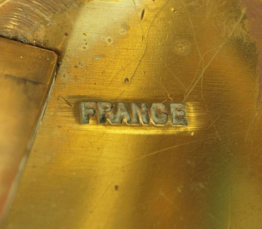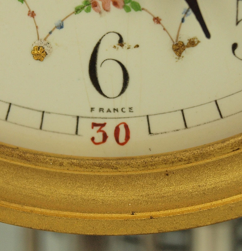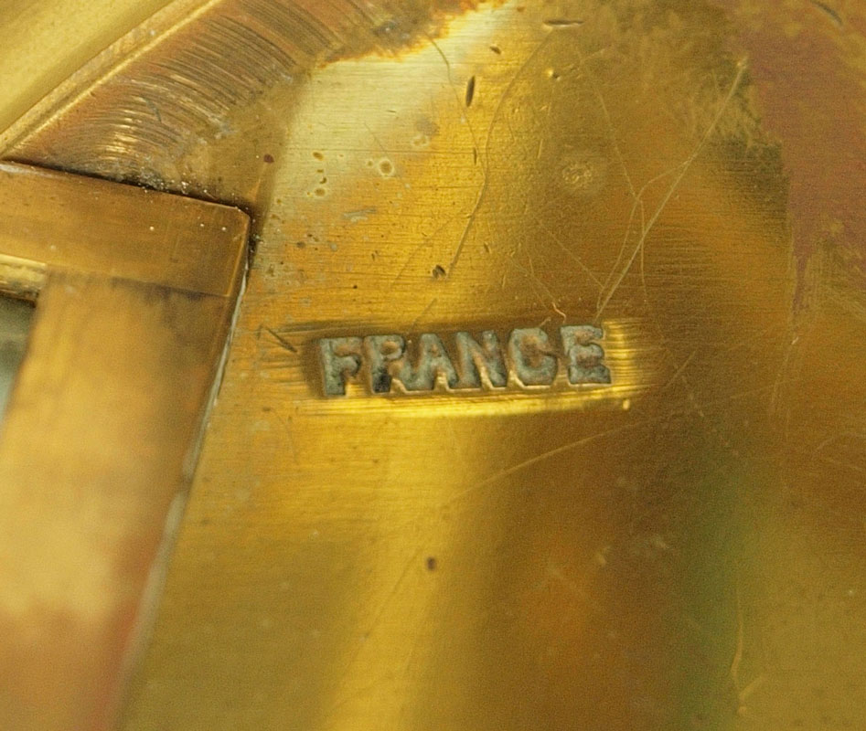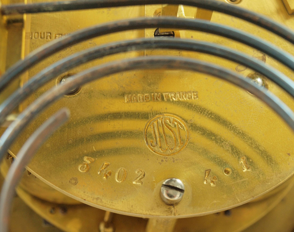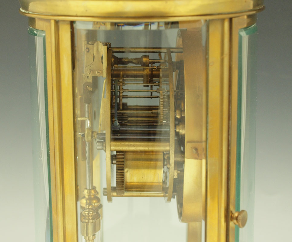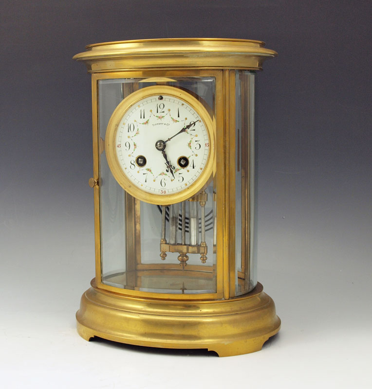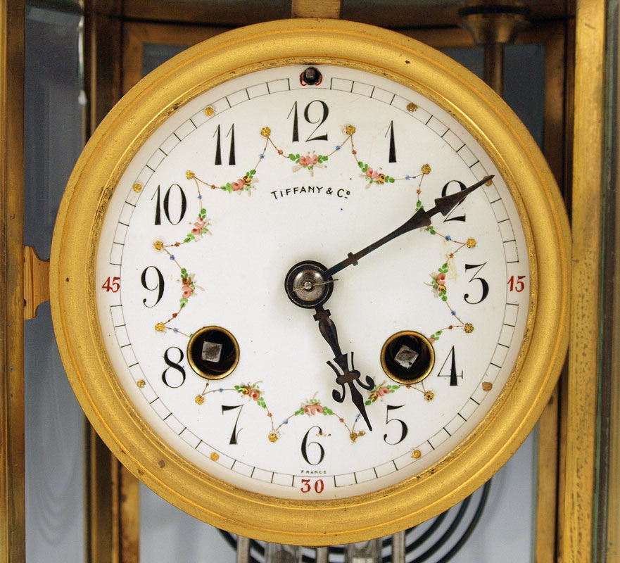 TIFFANY & CO. FRENCH CRYSTAL REGULATOR CLOCK: Curved brass case with beveled glass sides and doors. Enameled face with floral swag decoration, marked Tiffany & Co. Paris. French time & strike movement marked JUST. 10'' h. x 7 1/2'' x 6''. Key and mercury pendulum in office.