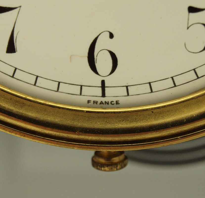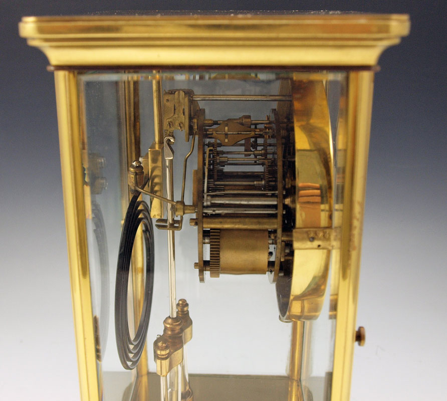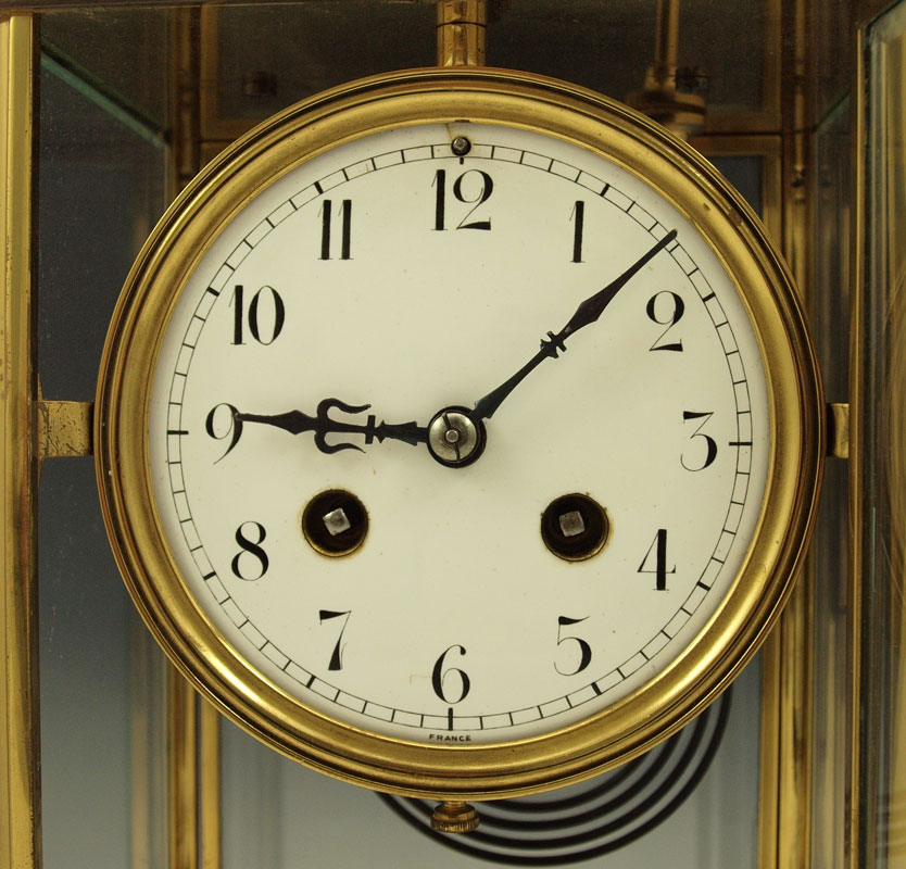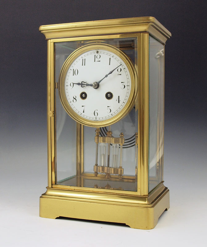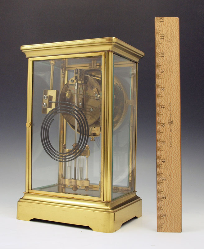 FRENCH CRYSTAL REGULATOR CLOCK: Brass case with beveled glass sides and doors. Enameled face with Arabic numerals, unsigned French time & strike movement. 10 3/4'' h. x 6 3/4'' x 4 1/4''. Key and Mercury pendulum in office.