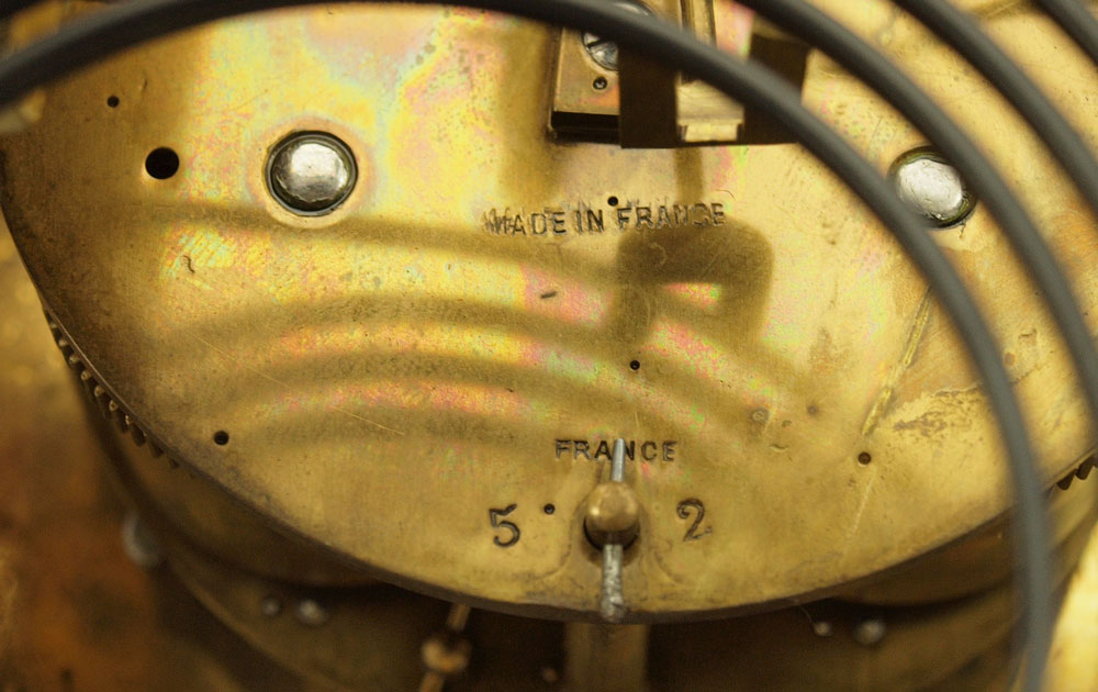 CONDITION: Note dullness and spotting to finish. Pendulum is mercury and cannot be shipped by normal shipping methods.