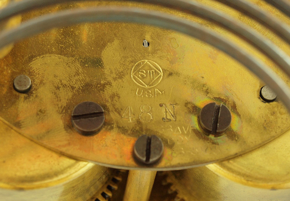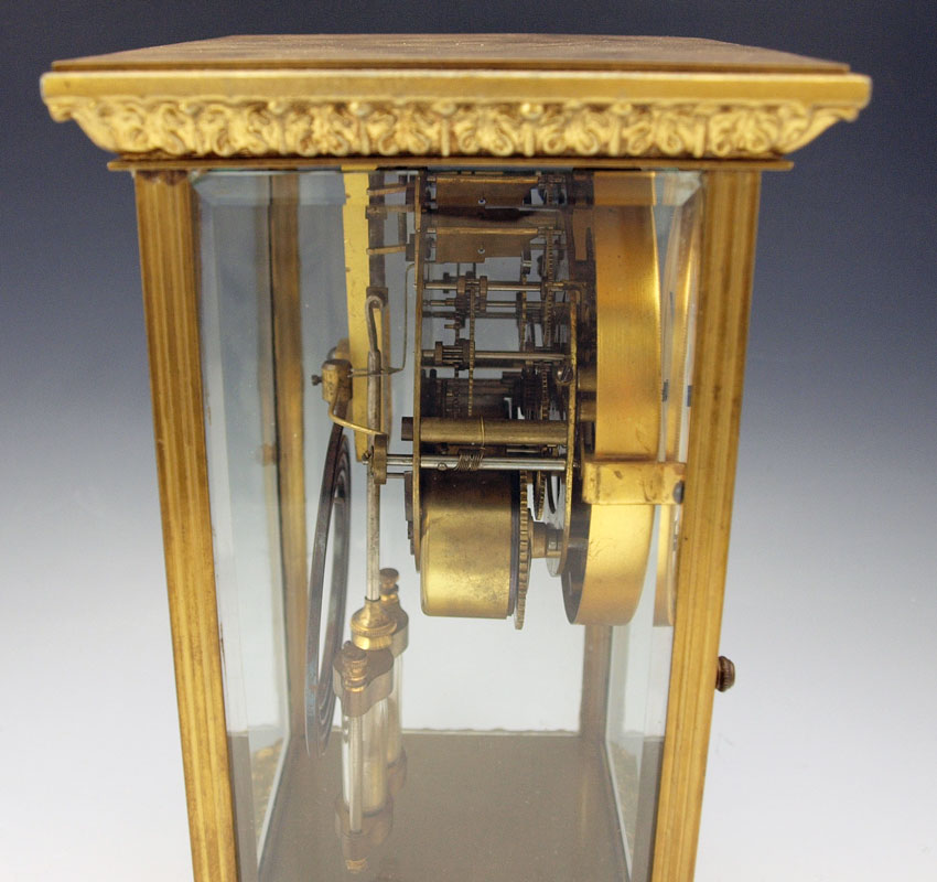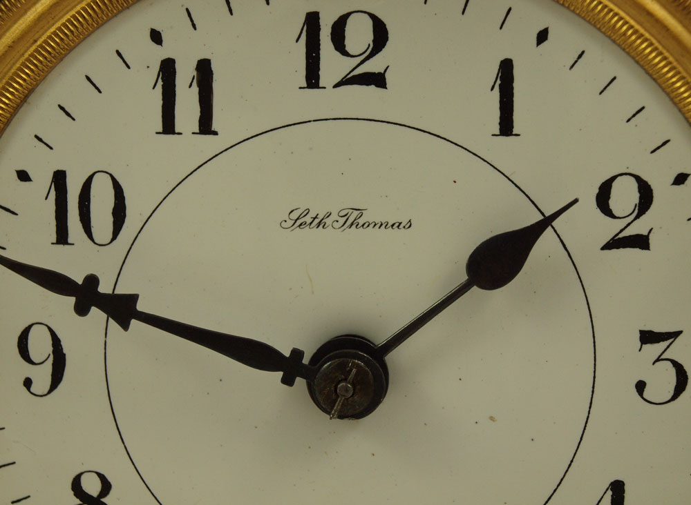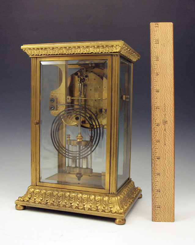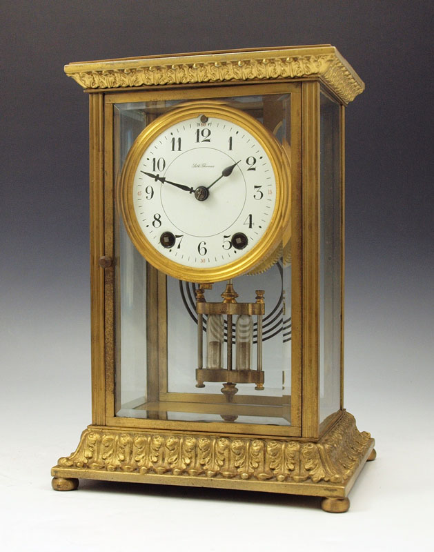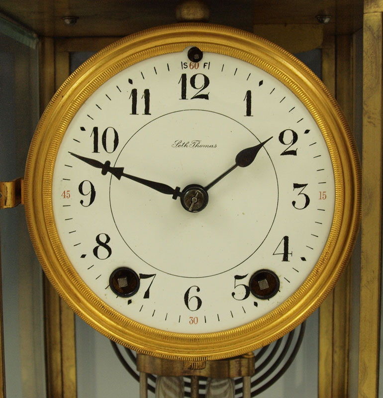 SETH THOMAS CRYSTAL REGULATOR CLOCK: Brass case with beveled glass sides. Marked Seth Thomas on face and time & strike movement. 10 3/4'' h. x 7 1/2'' x 6''. Key and mercury pendulum in office.