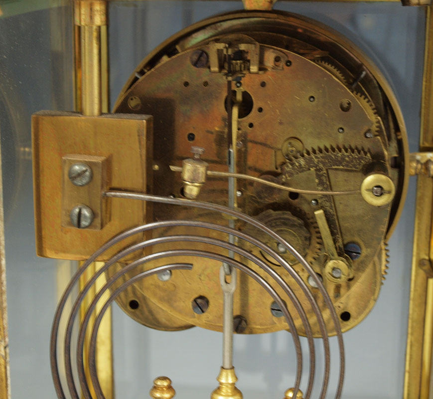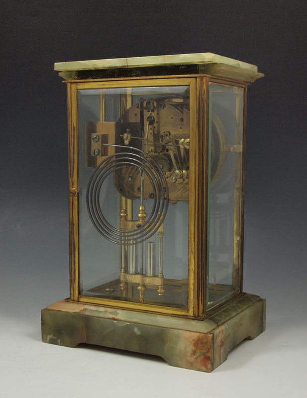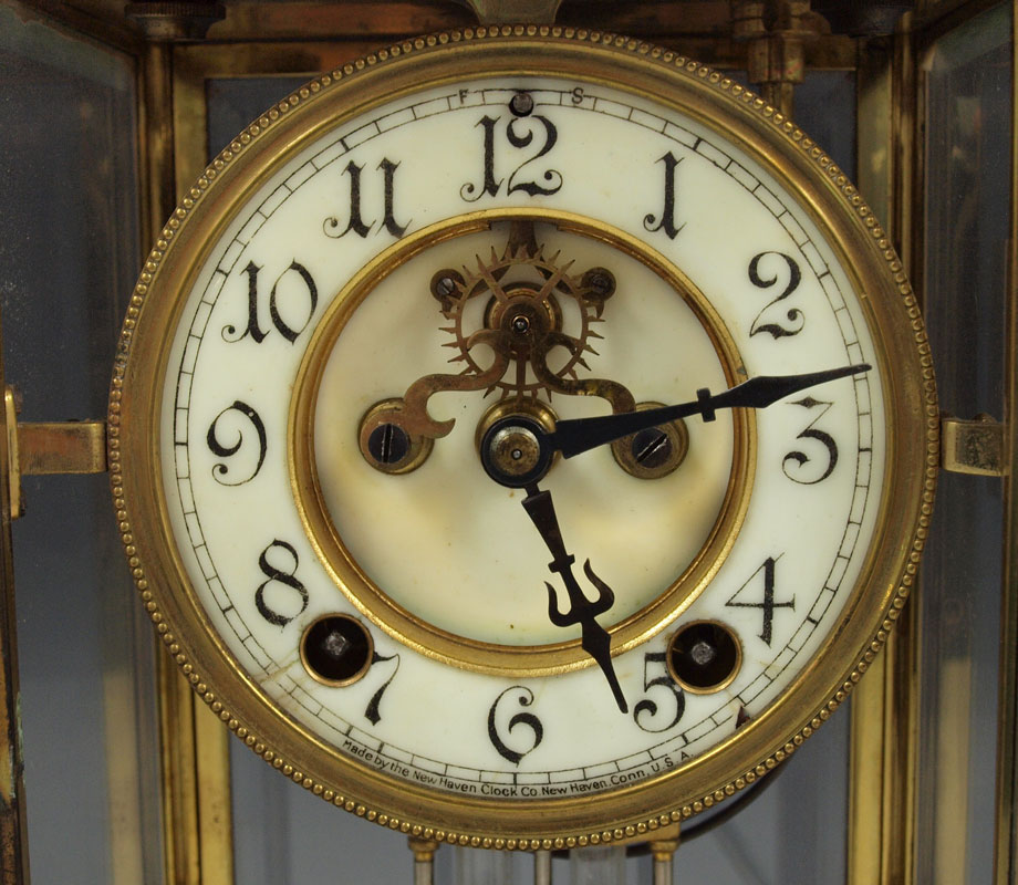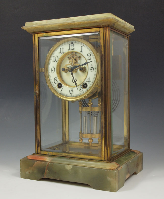 NEW HAVEN ONYX CRYSTAL REGULATOR CLOCK: Onyx top and base with brass and beveled glass sides. New Haven time & strike movement with open escapement on enameled face. Arabic numerals. Faux mercury pendulum. 11 1/4'' h. x 7 1/2'' 6''. Key & pendulum in office.