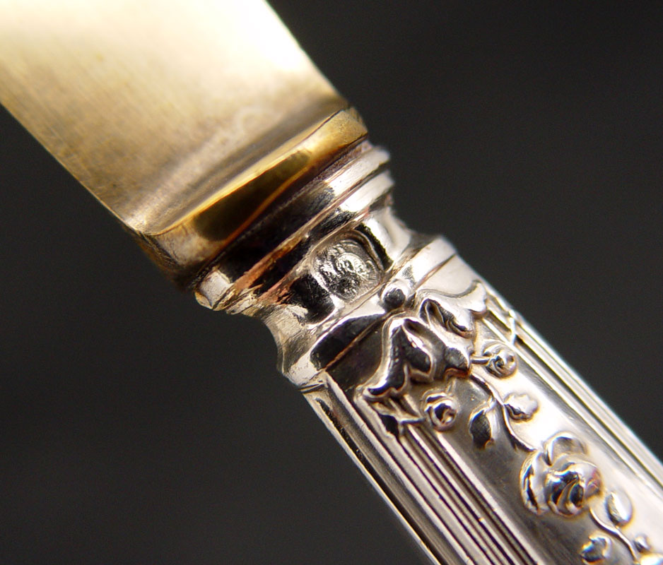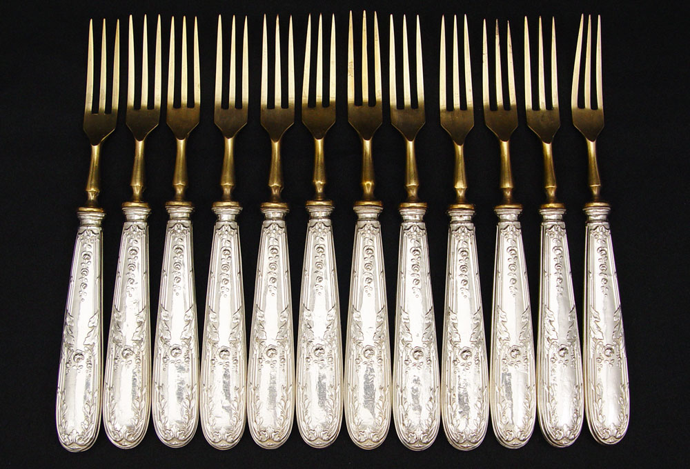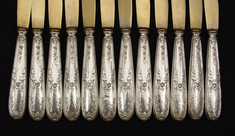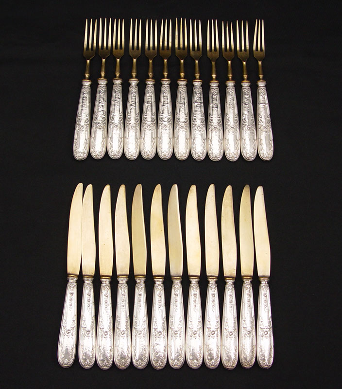FRENCH FINE SILVER HANDLE DESSERT SET: Unknown maker with French Minerva silver guarantee mark, to include 12 dessert forks 6 1/4'', 12 knives 7''. Hollow handle with metal blades and tines. Approx. 12 troy oz. unknown silver content.