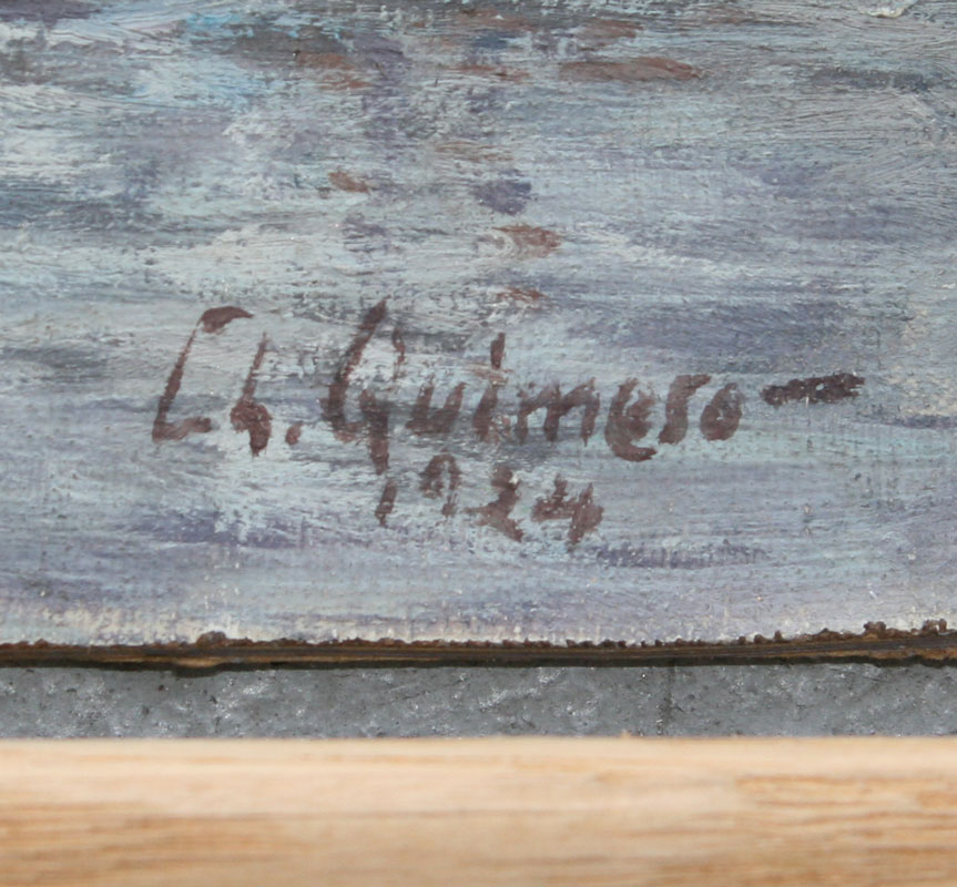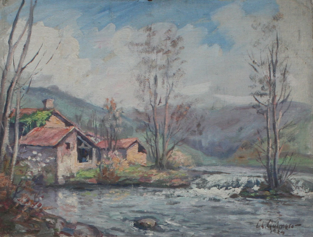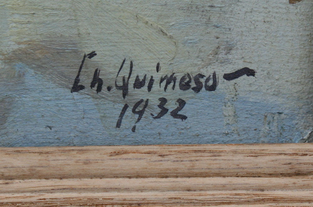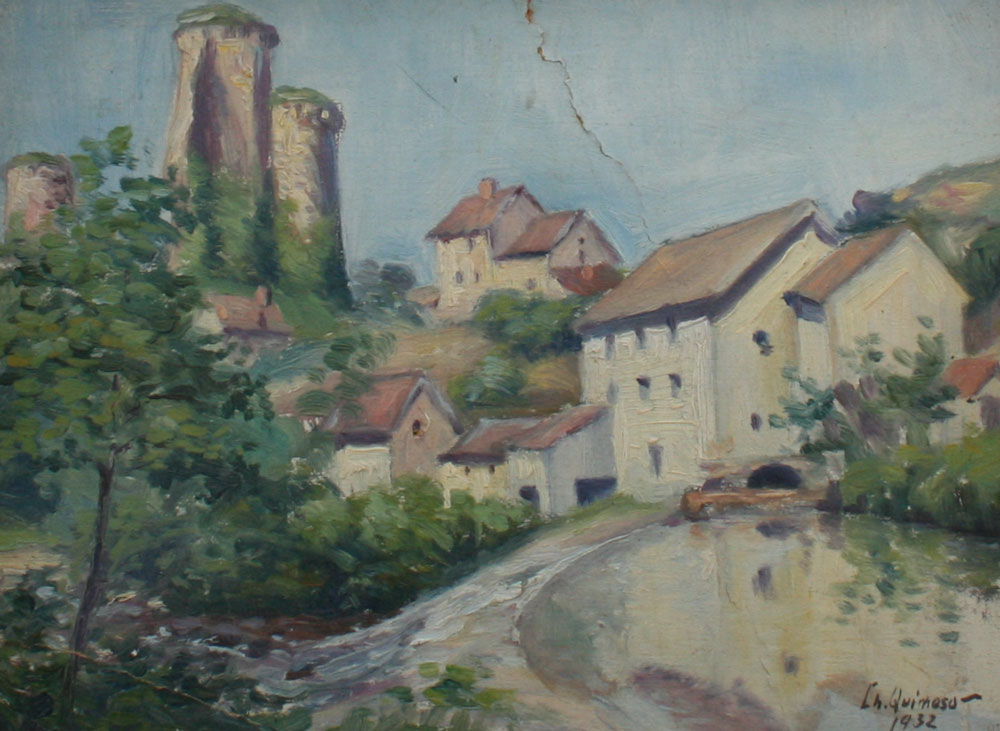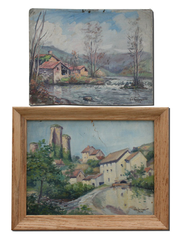 QUIMESO, Charles, (European, 20th C.): 2 pieces to include 1) French Village Scene, 1932, OIL/Board, 11'' x 14''. 2) Trees on Riverbank, OIL/Board, 9'' x 11'', signed and dated, 1924, unframed.