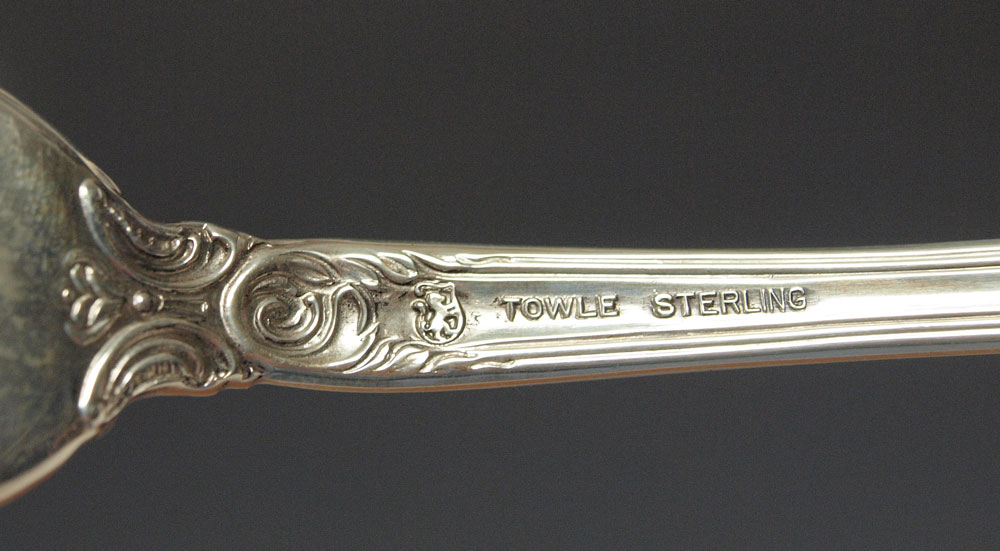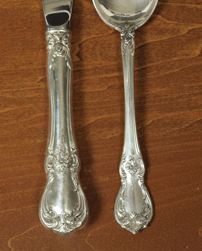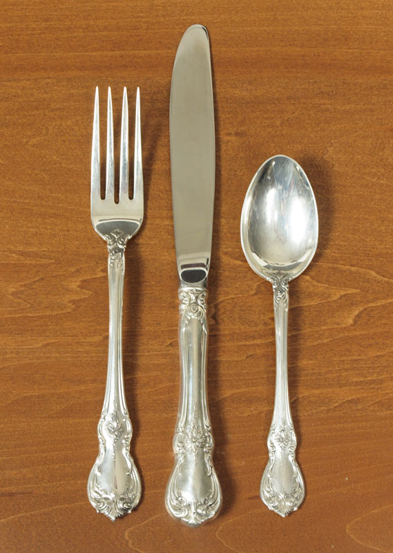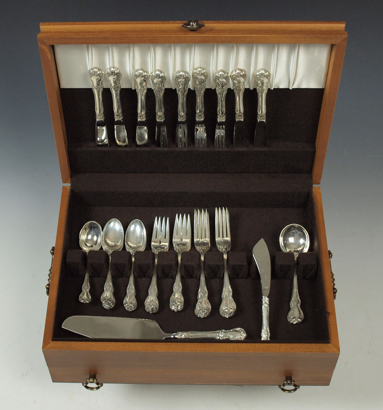 TOWLE OLD MASTER STERLING FLATWARE SERVICE: Approx 43 pieces in the Old Master pattern by Towle to include 9 forks (7 1/4''), 9 salad forks (6 1/4''), 9 teaspoons (6''), 4 oval soup spoons (6 1/4''), 9 hollow dinner knives (8 3/4''), hollow master butter knife (6 3/4''), sugar scoop (5 3/4''), cake / pie server (10 3/8''). No monograms. Approx 46.1 troy oz. Sold with wood silver chest 6'' x 17'' x 12''