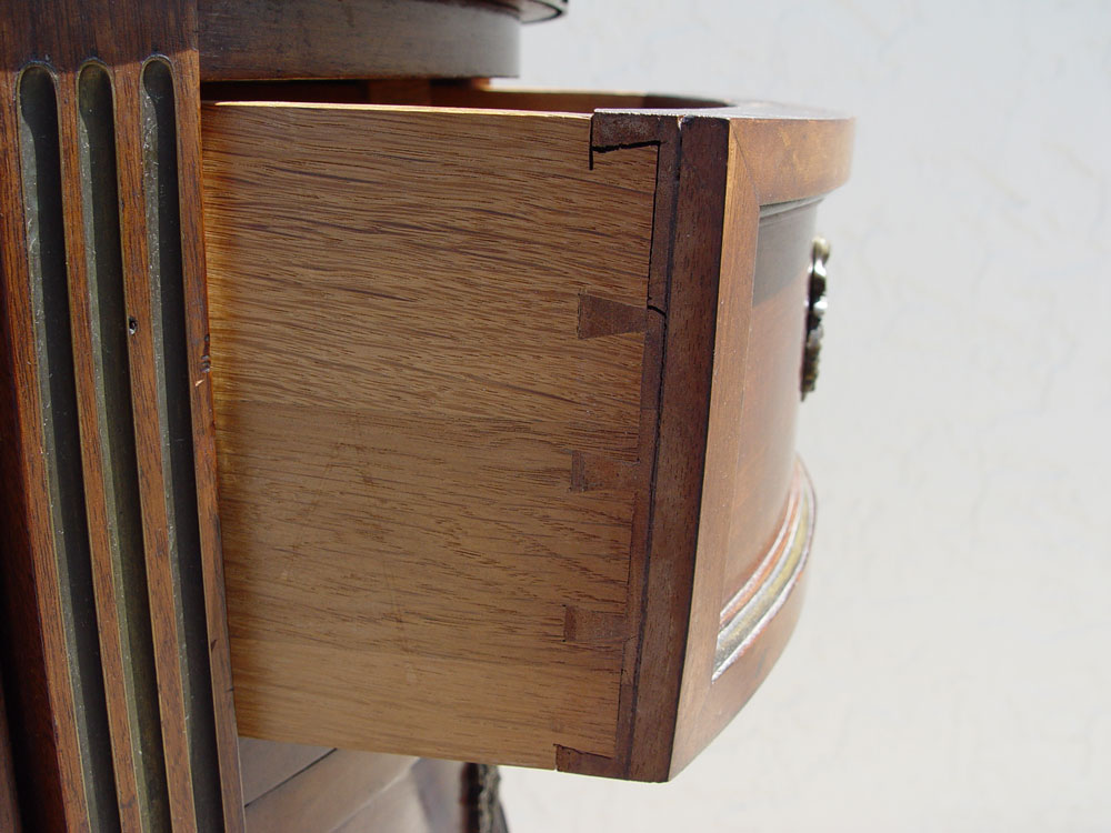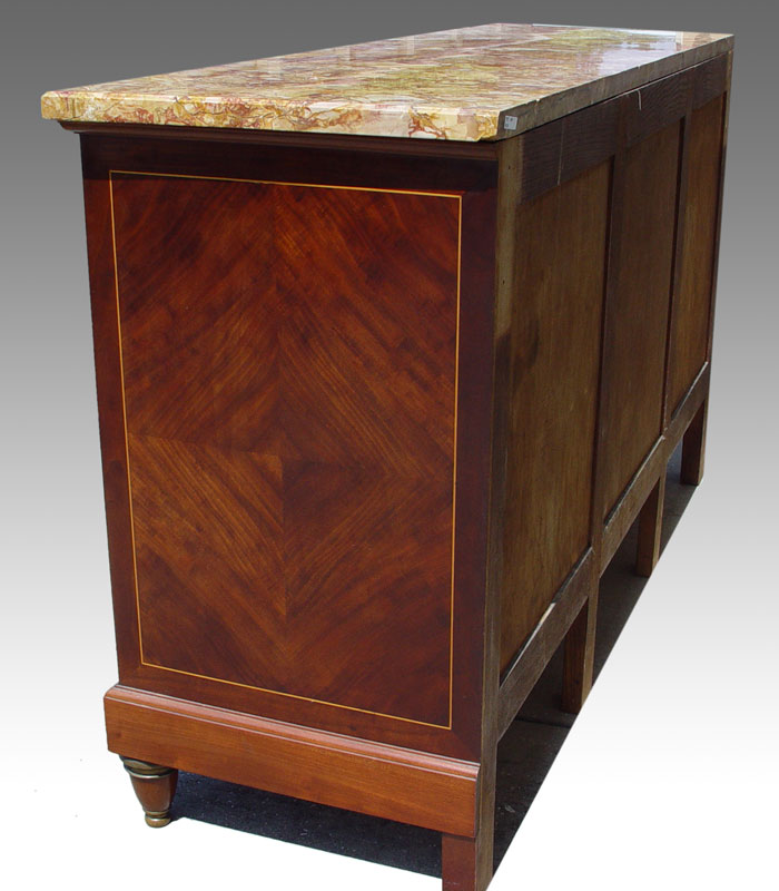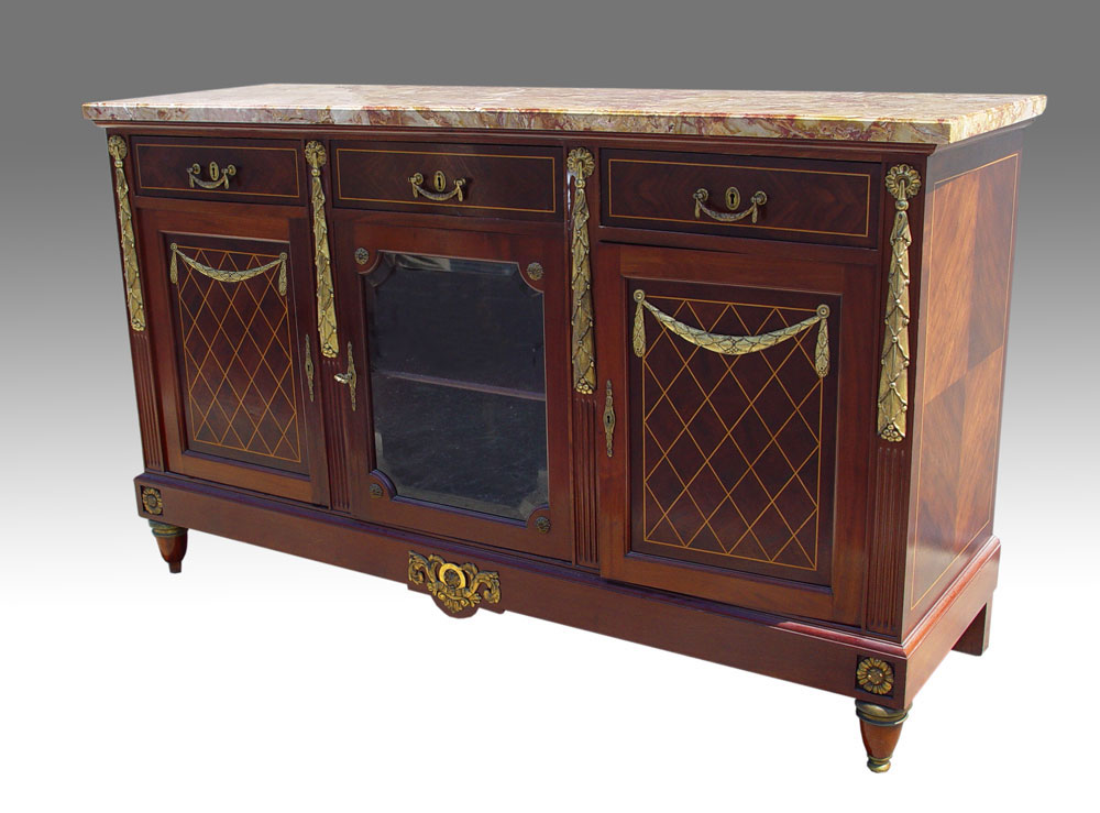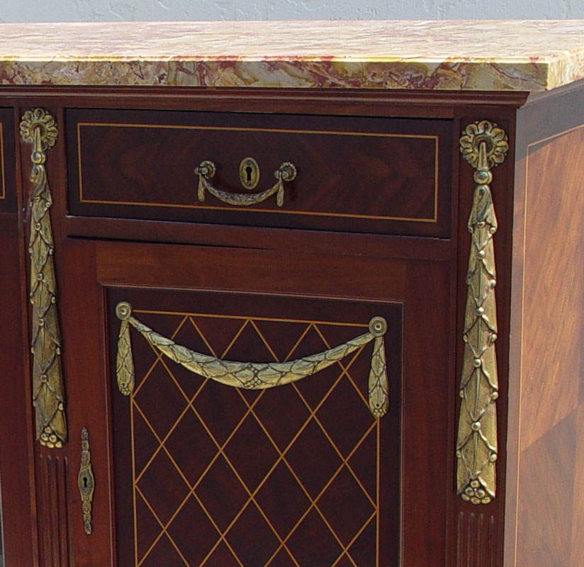 FRENCH LOUIS XVI STYLE ORMOLU MOUNTED SIDE CABINET: Marble top over cabinet of string inlay and geometric veneers, Three drawers over 3 doors, the center door having a beveled glass front. Key locking. Approx. 39 1/2'' h. x 67'' x 21 1/4''. One of a pair with the matching side cabinet at the following lot 14.