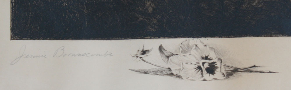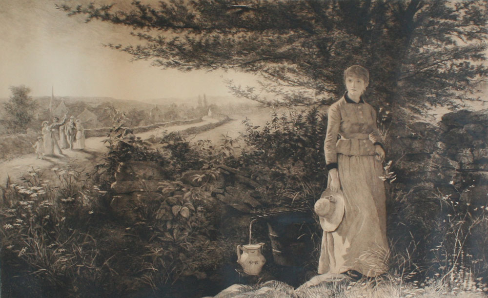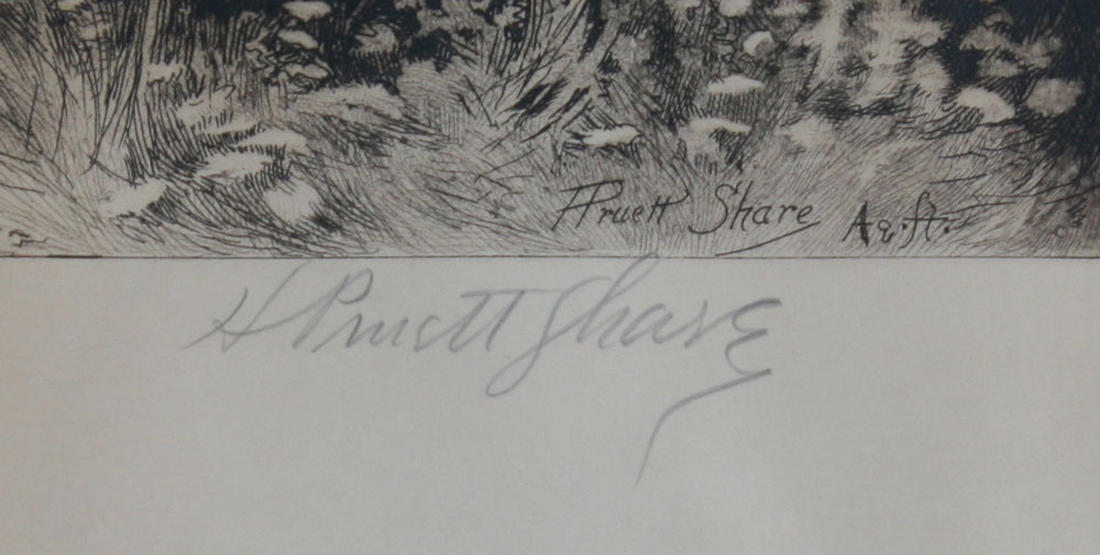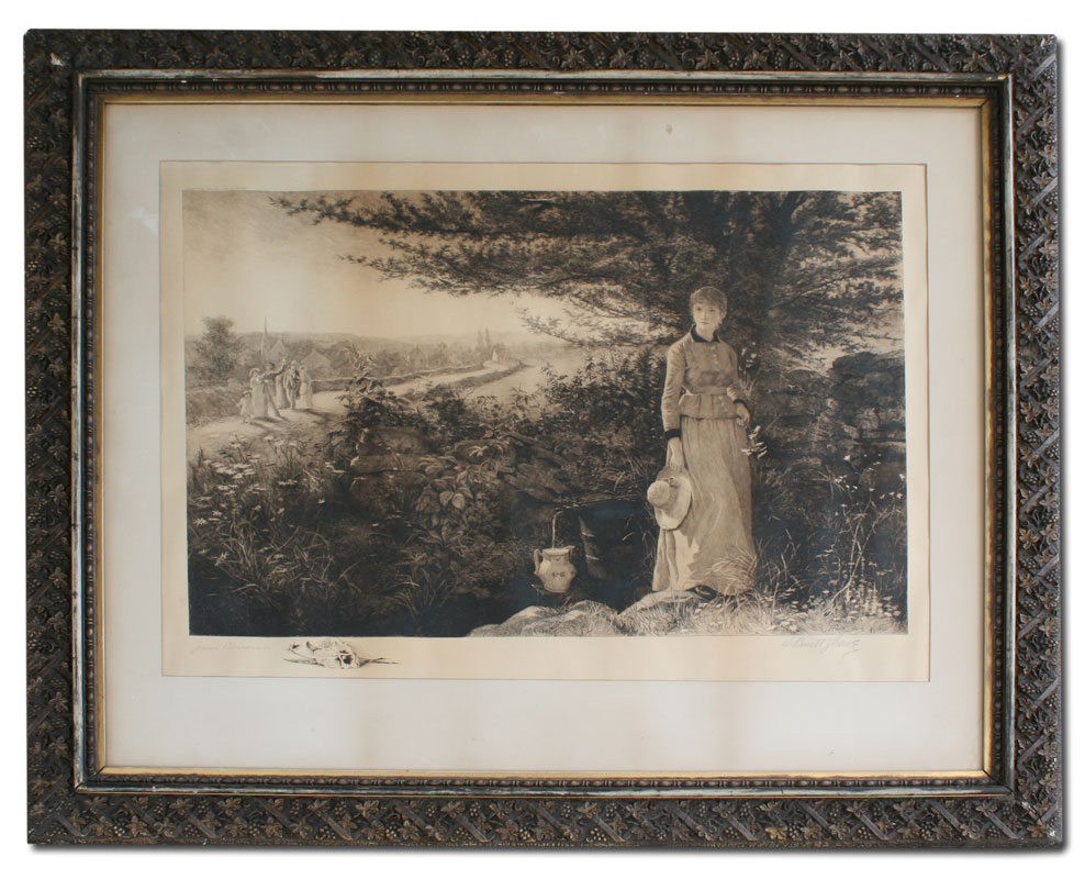 SHARE, Henry Pruett, (American, 1835-1905): 19th C. Genre Scene, etching by Jenny Brownscombe after Henry Pruett Share, signature in lower margin, sight size 24'' x 34'', gilded gesso frame 39'' x 46''.