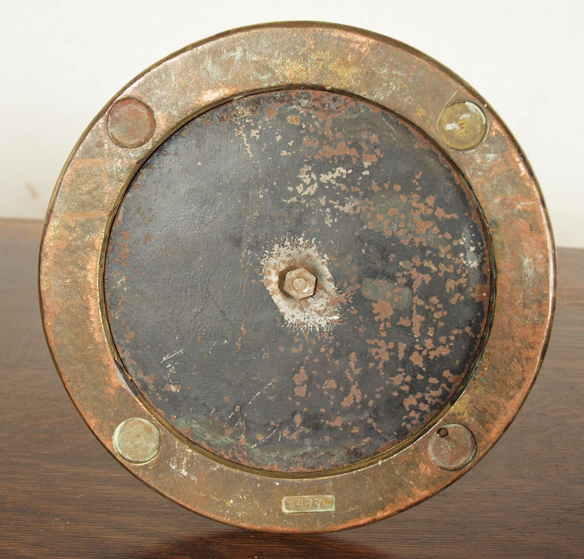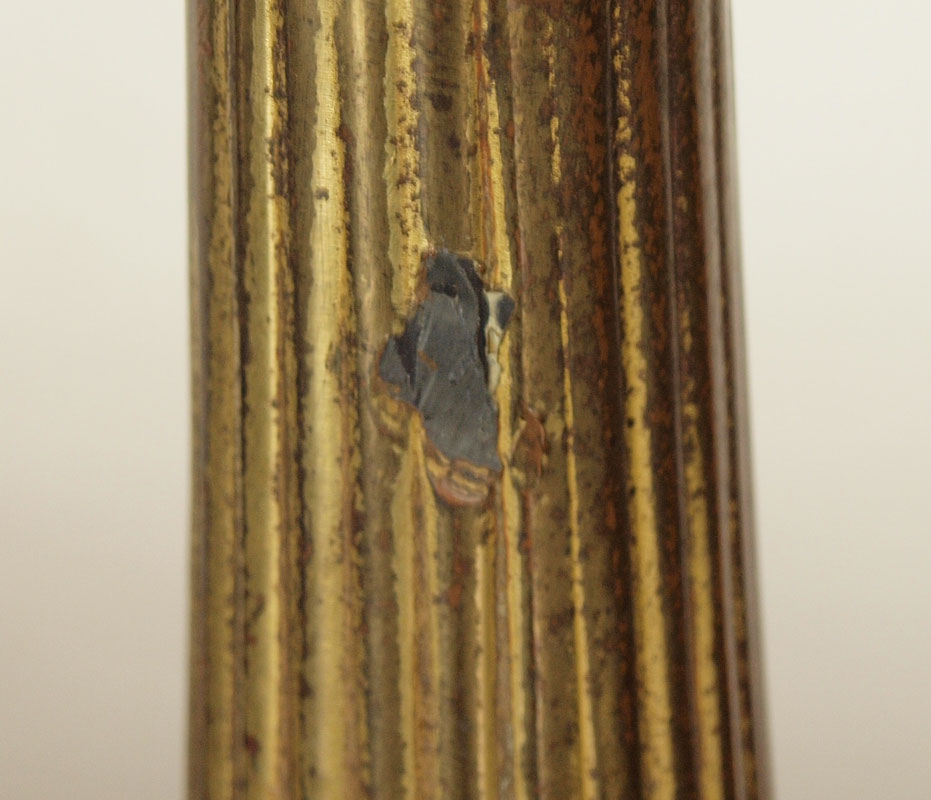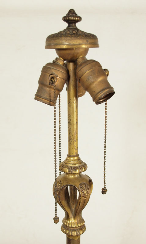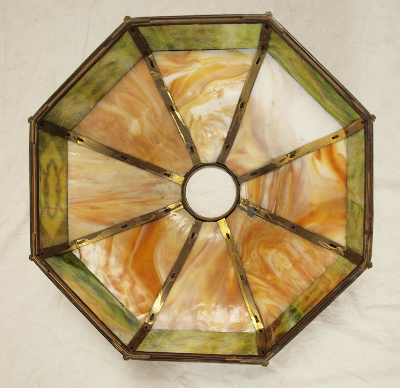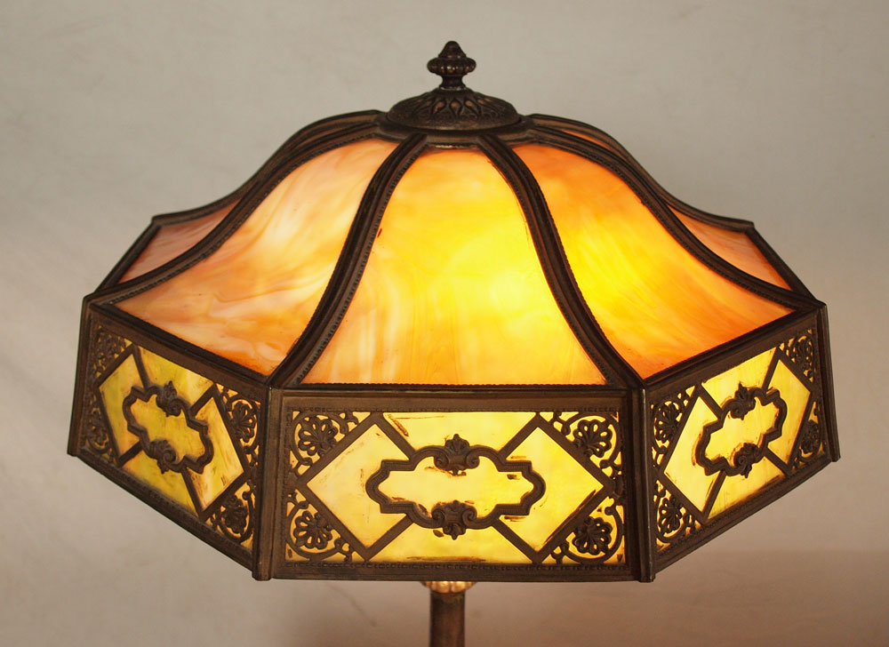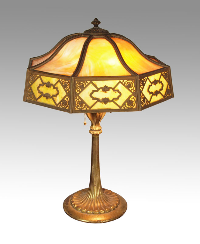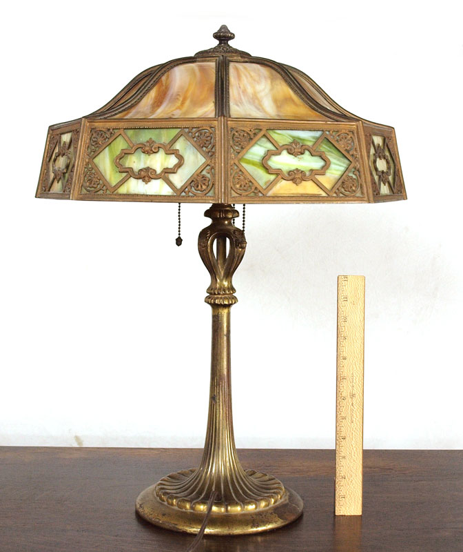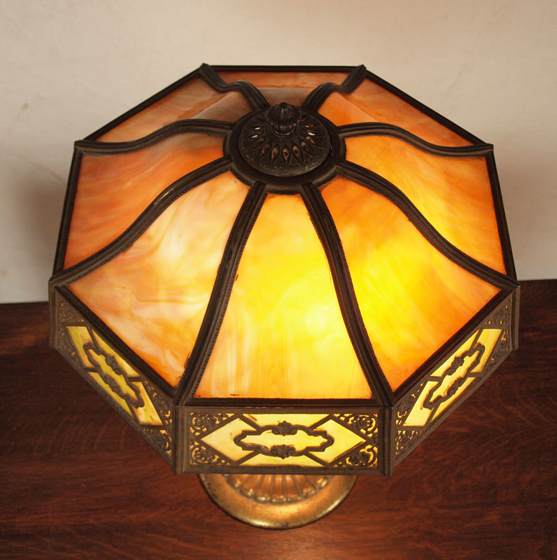 VINTAGE BENT PANEL SLAG GLASS TABLE LAMP: Eight caramel slag bent panels over blue straight panels. Heavy metal base with worn original gilt finish. Three sockets, pull chains with acorns. Shade is 17'' dia. Lamp 24'' tall.