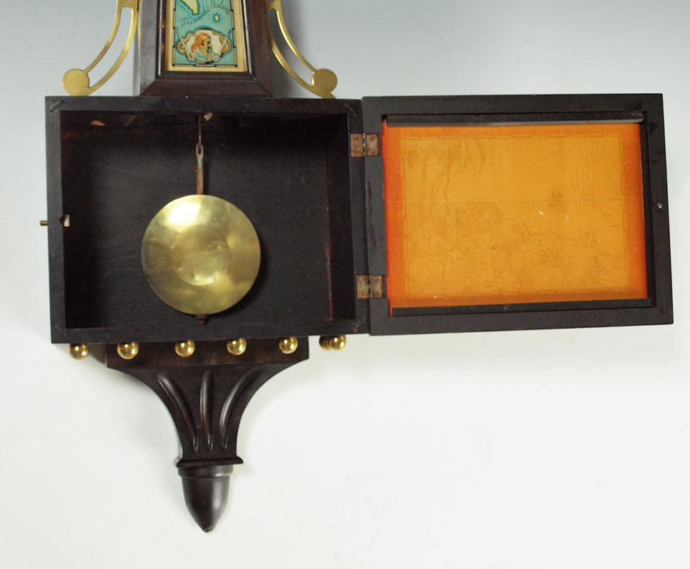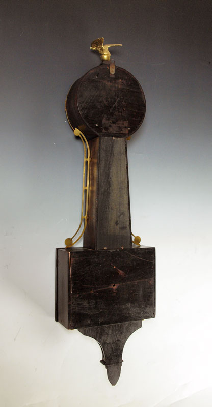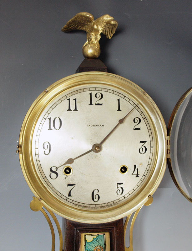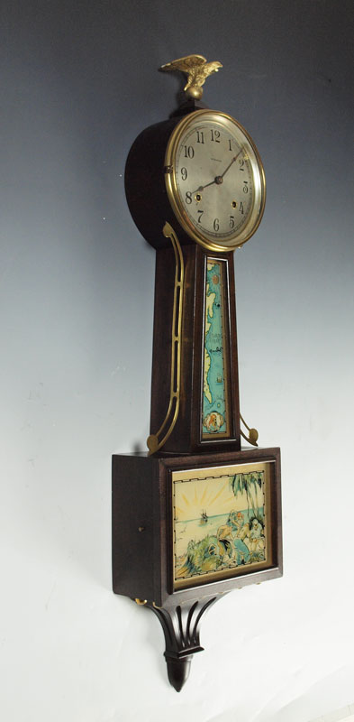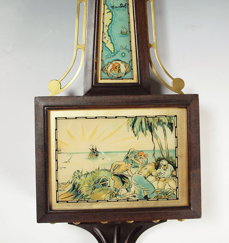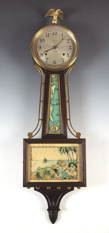 TREASURE ISLAND INGRAHAM BANJO CLOCK: 8 day time & strike movement. Brass accents & eagle finial. Reverse painted scene of pirates burying treasure and Atlantic ocean map. Metal face with Arabic numerals. 39 1/2'' h. x 10 3/4'' x 4 1/4''. Key & pendulum in office.