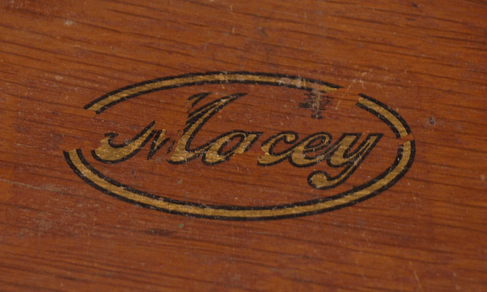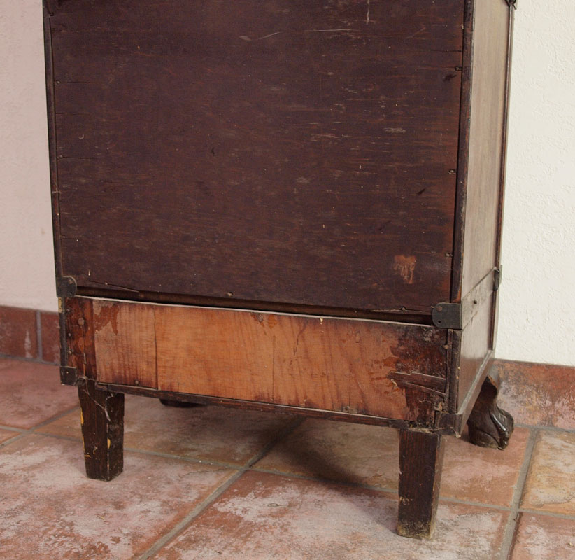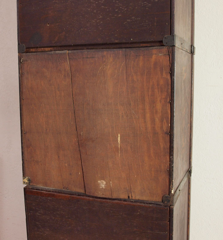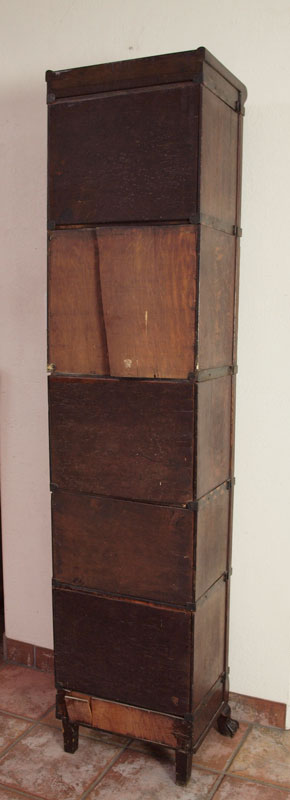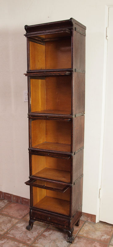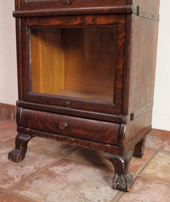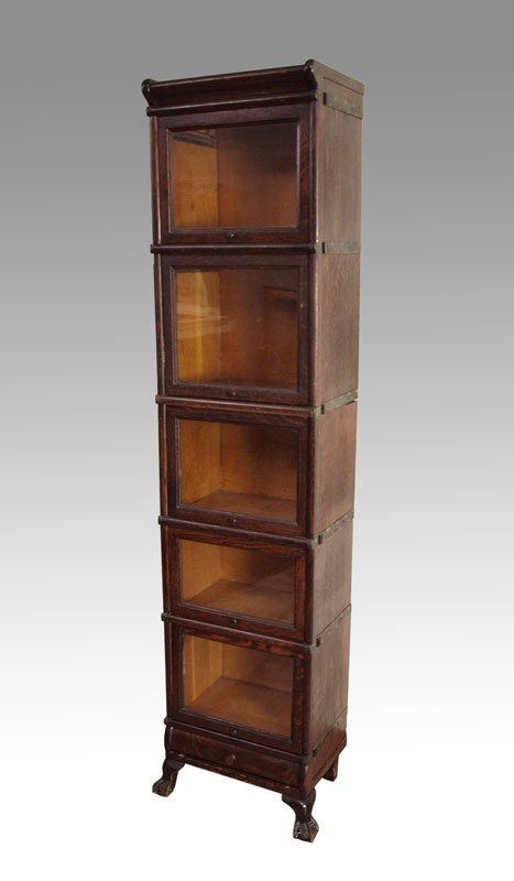 RARE MACY HALF SIZE QUARTER SAWN OAK BOOKCASE: Five sections on carved paw feet, drawer at the bottom. Approx. 6 ft tall x 17'' wide x 11'' deep. Original finish and glass.