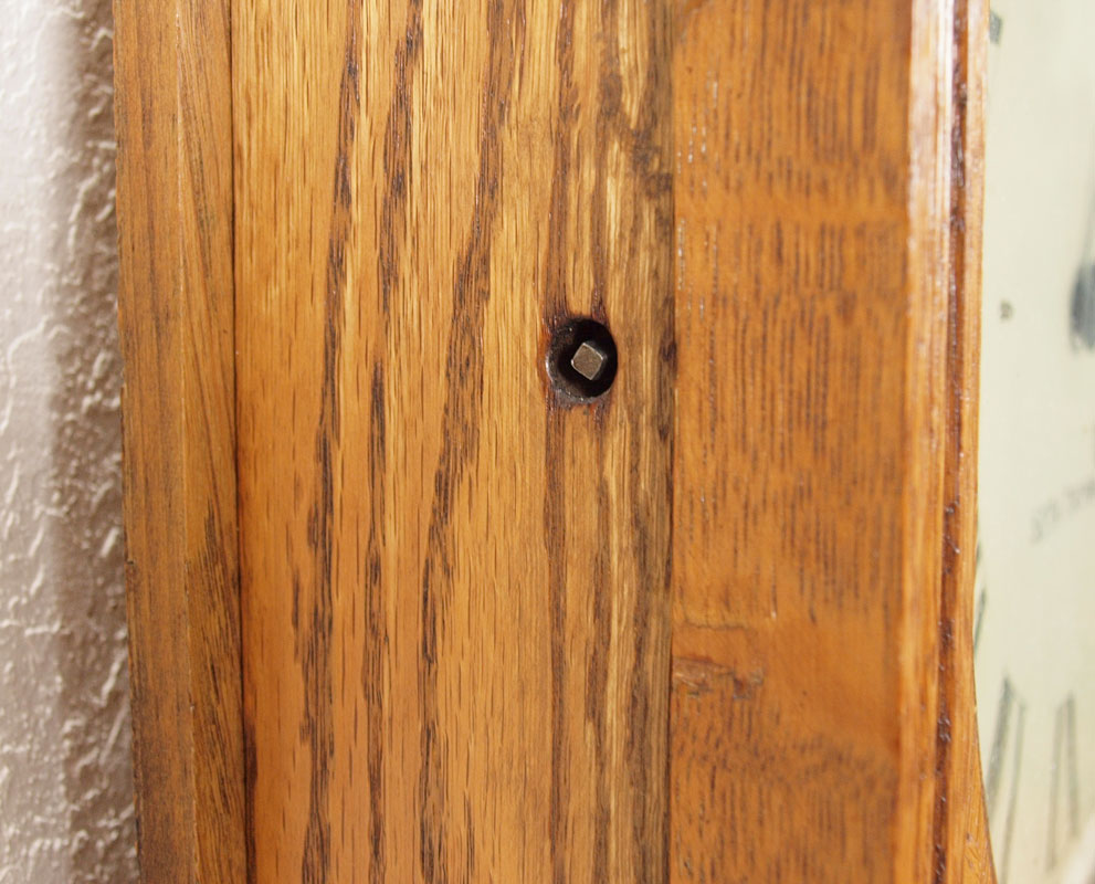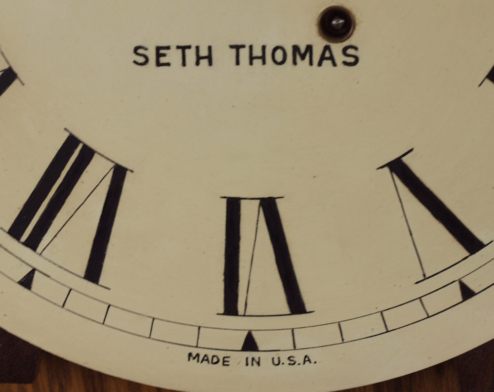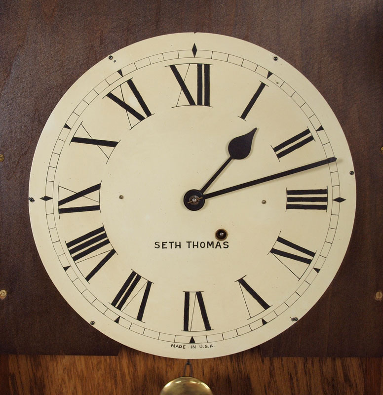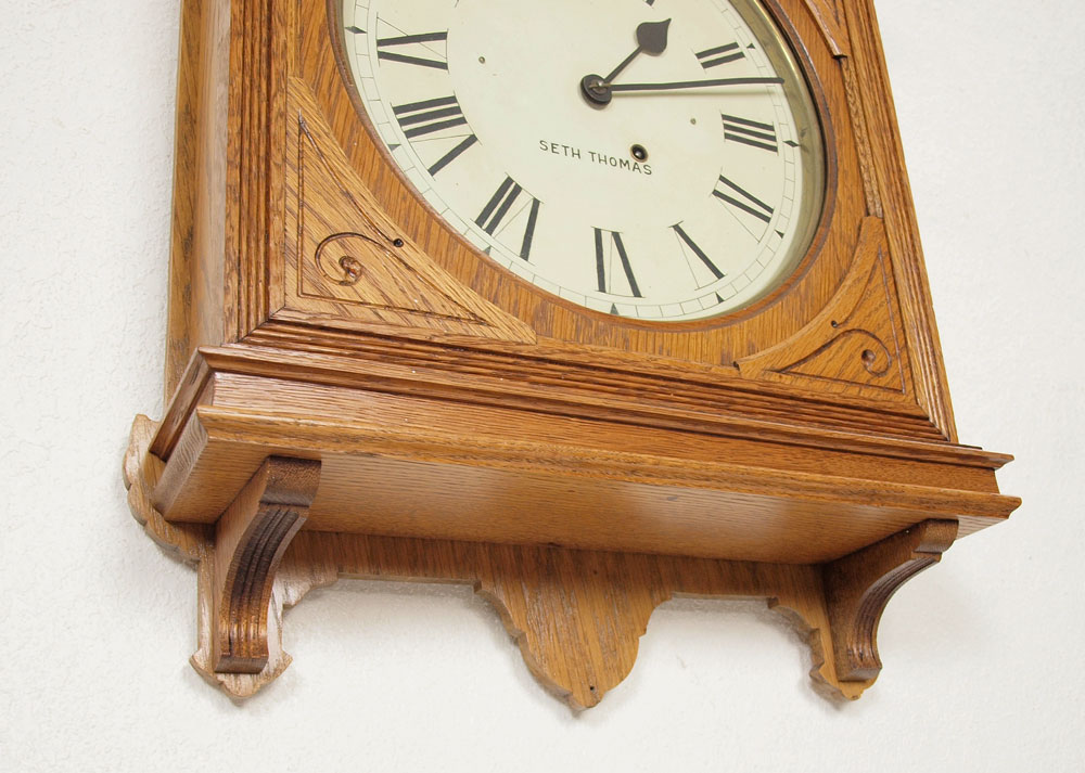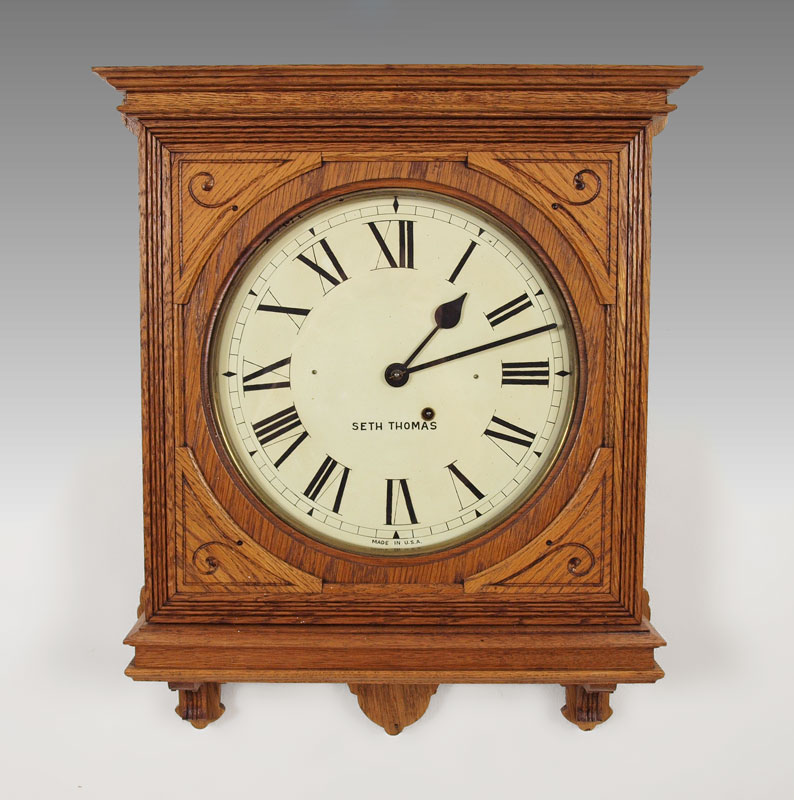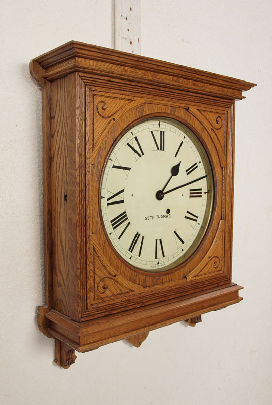 SETH THOMAS #5 OFFICE REGULATOR CLOCK: Carved oak case, time only movement. Painted metal face with Roman numerals. 23 1/2'' h. x 19 1/4'' x 5 3/4''. Key and pendulum in office.