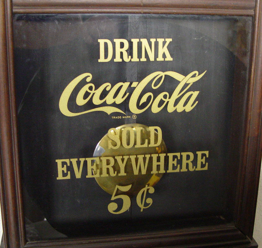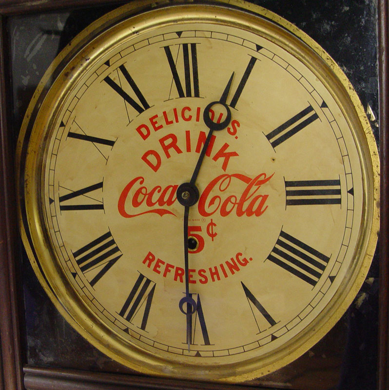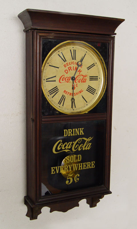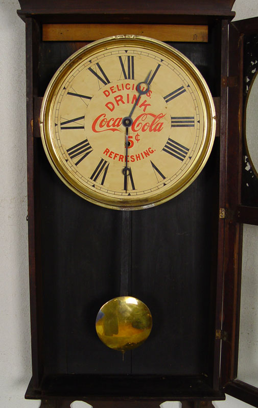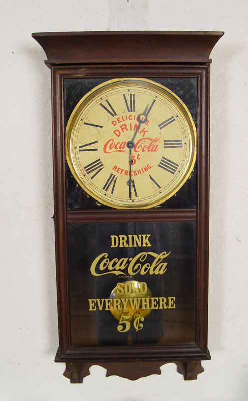 COCA COLA ADVERTISING WALL REGULATOR CLOCK: Metal face with applied paper reads ''Delicious Drink Coca Cola 5 cent Refreshing''. Reverse painted bottom glass reads ''Drink Coca Cola Sold Everywhere 5 cent''. 36'' x 17 3/4'' x 5 1/4''. Key in office.