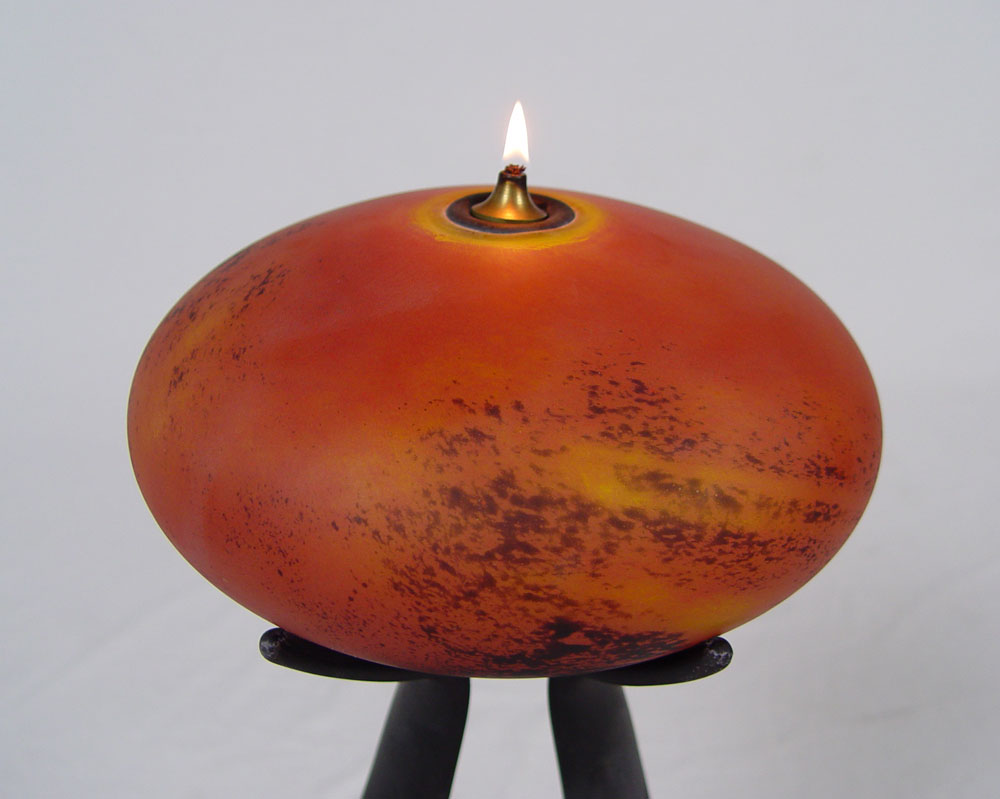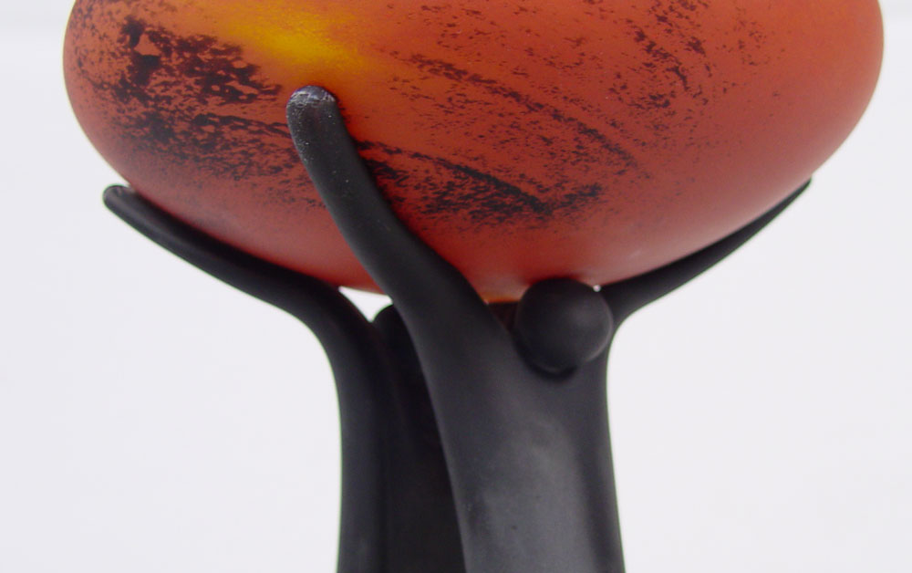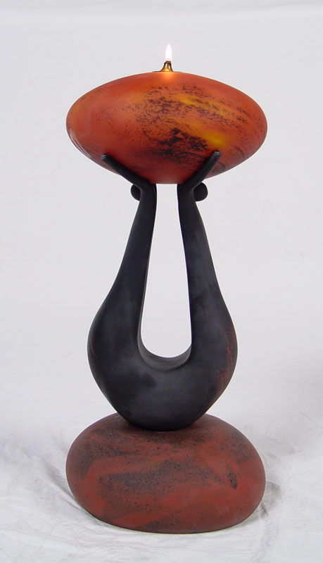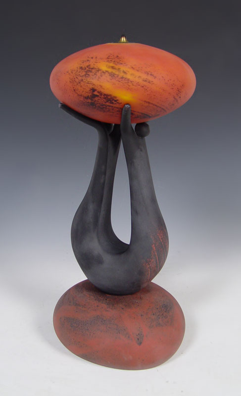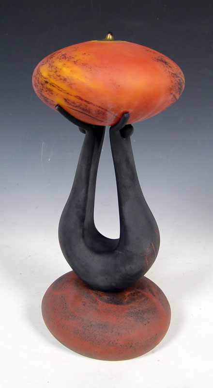 CONTEMPORARY STUDIO ART GLASS OIL LAMP BY CHUCK SIMPSON: New Zealand artist, two blown glass figures in black hold aloft the smooth glass font, on textured oval base, signature inside bottom, approx. 20'' x 8 1/2'' x 9 1/2''.