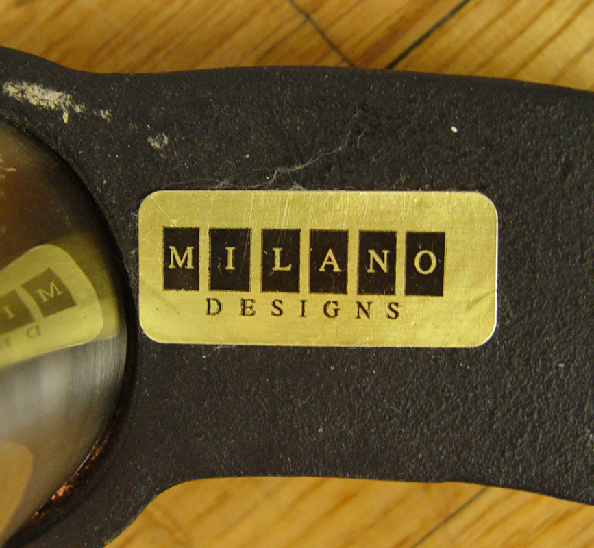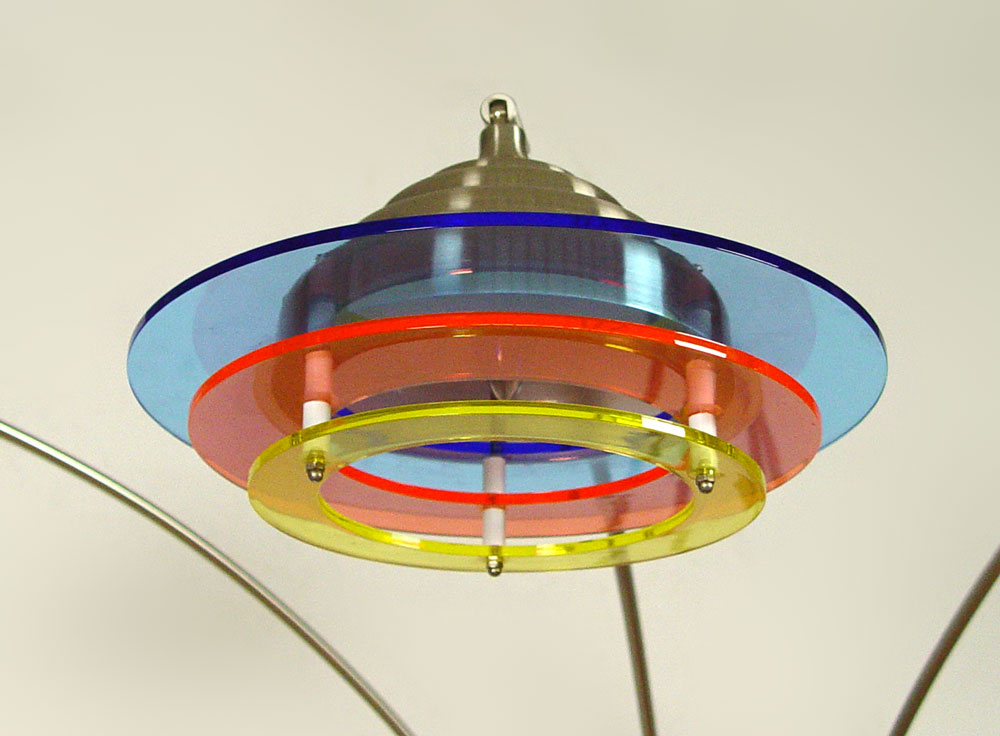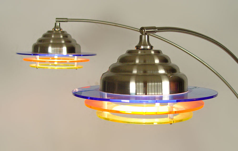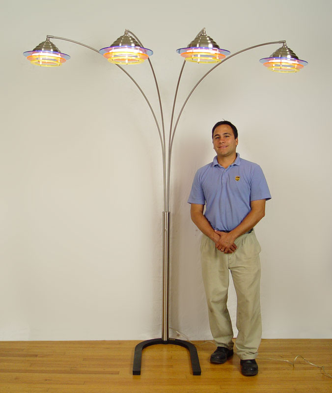 MILANO DESIGNS 4 LIGHT FLOOR LAMP: Moderne design with brushed metal and Lucite shade construction. Milano designs foil sticker. Measures approx. 85 1/2'' h. x 59'' x 46'' overall.