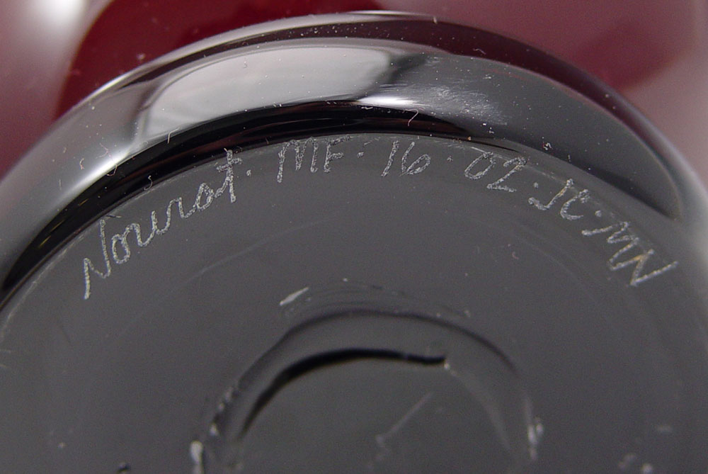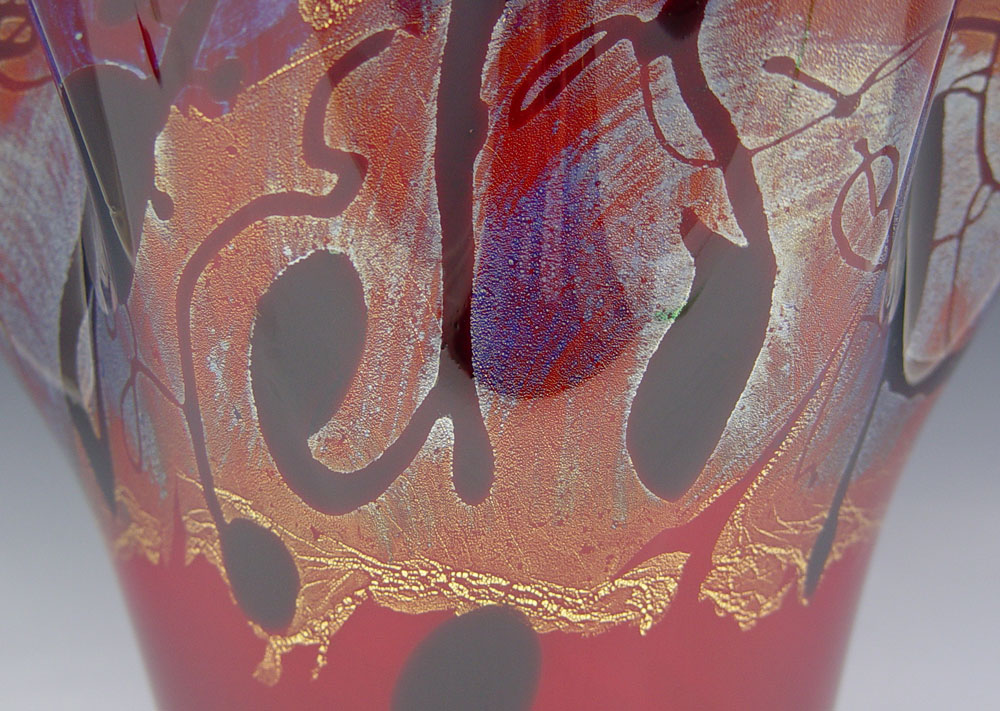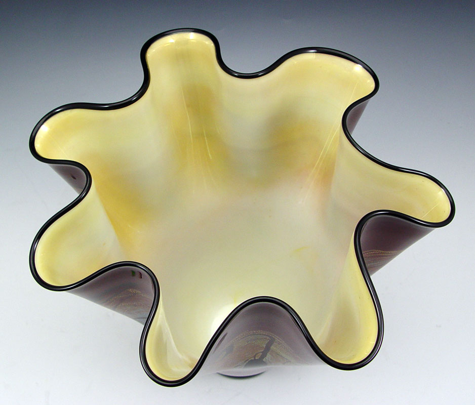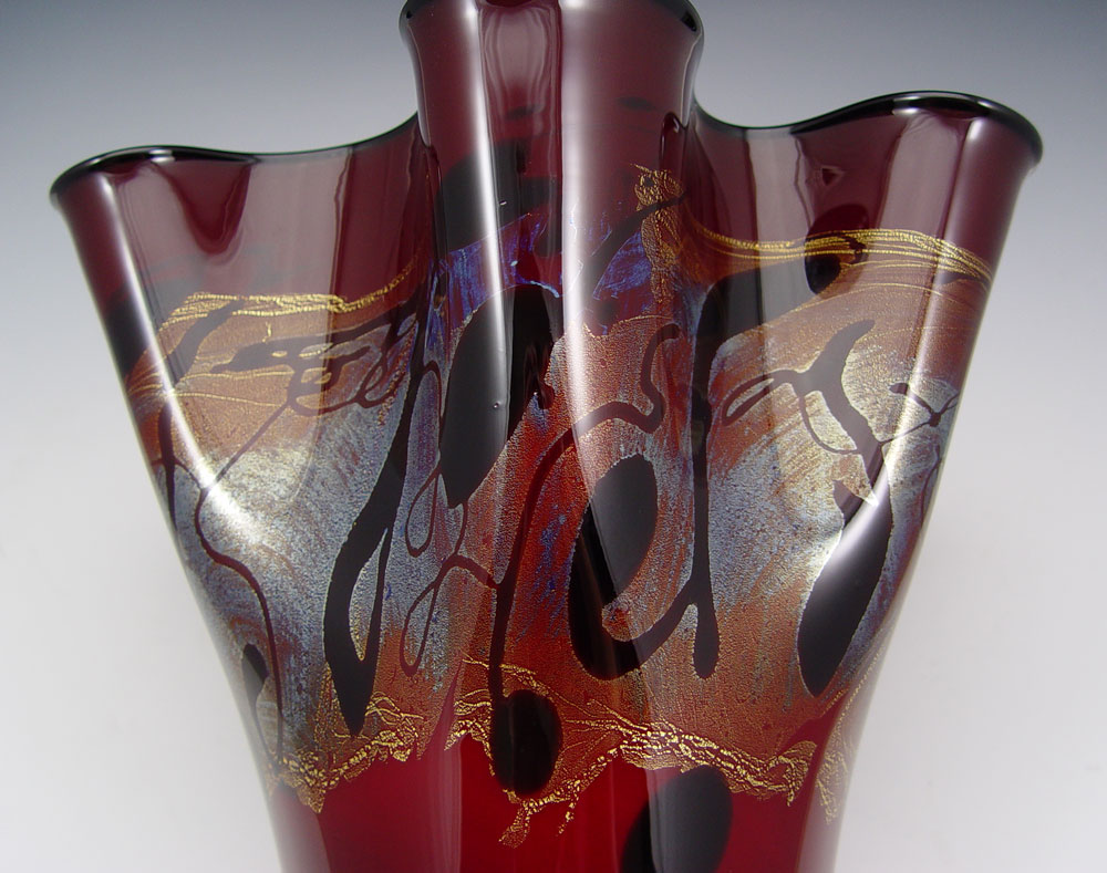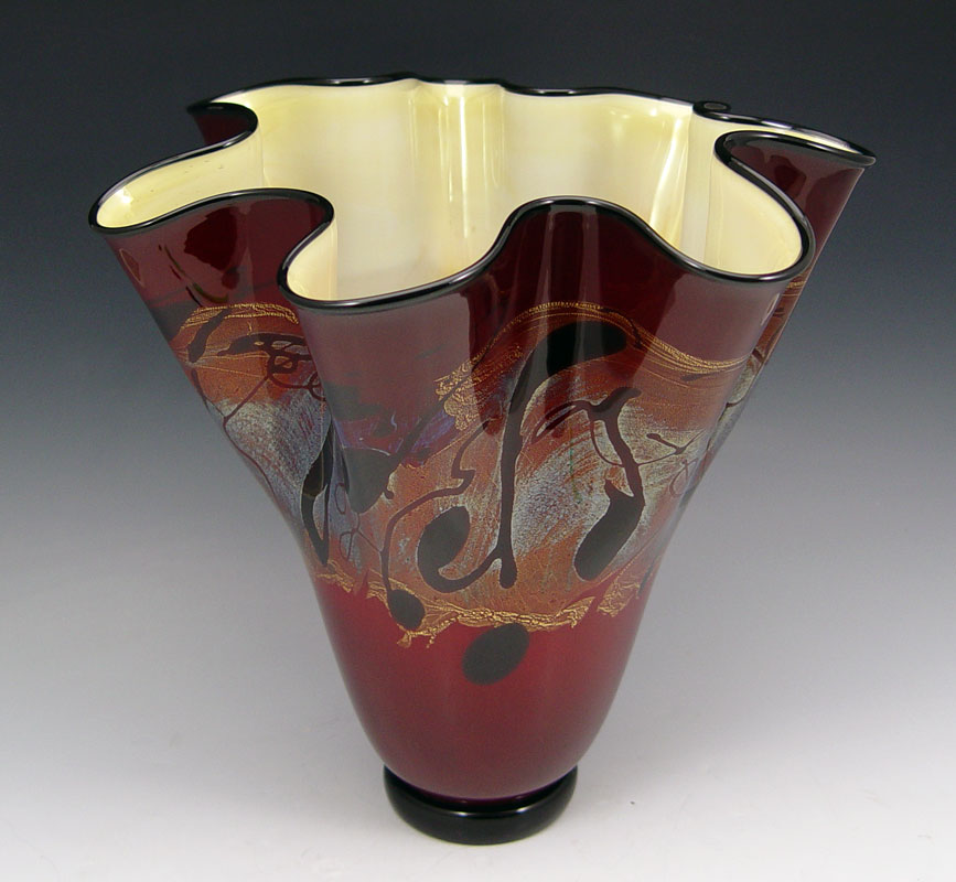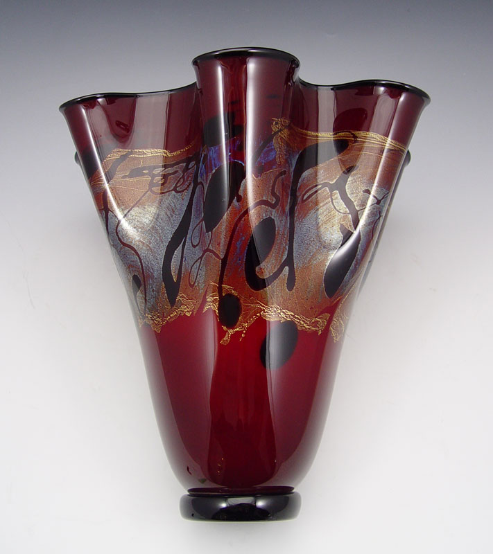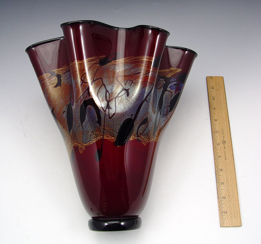 NOUROT GLASS STUDIO ''RED SATIN FLUTE'' VASE: Solid crimson top to bottom with luster interior, black base and top ribbon, signed on bottom ''Nourot.MF.16.02.JC.MN'', 12'' at highest point, approx. 12'' diameter.