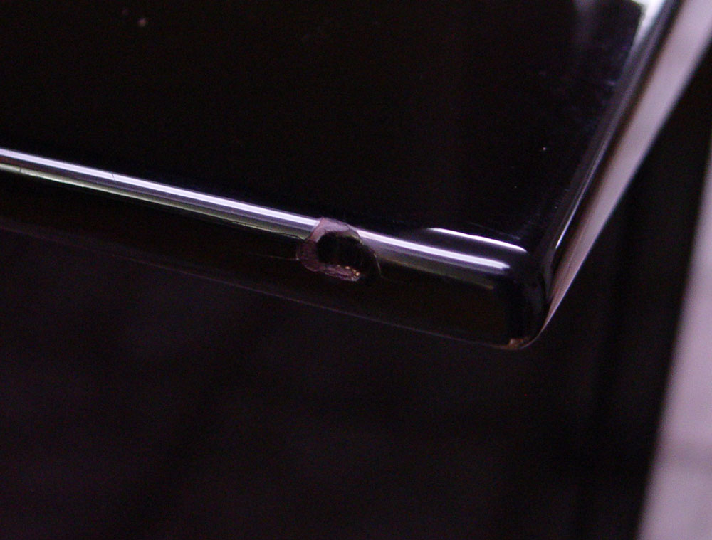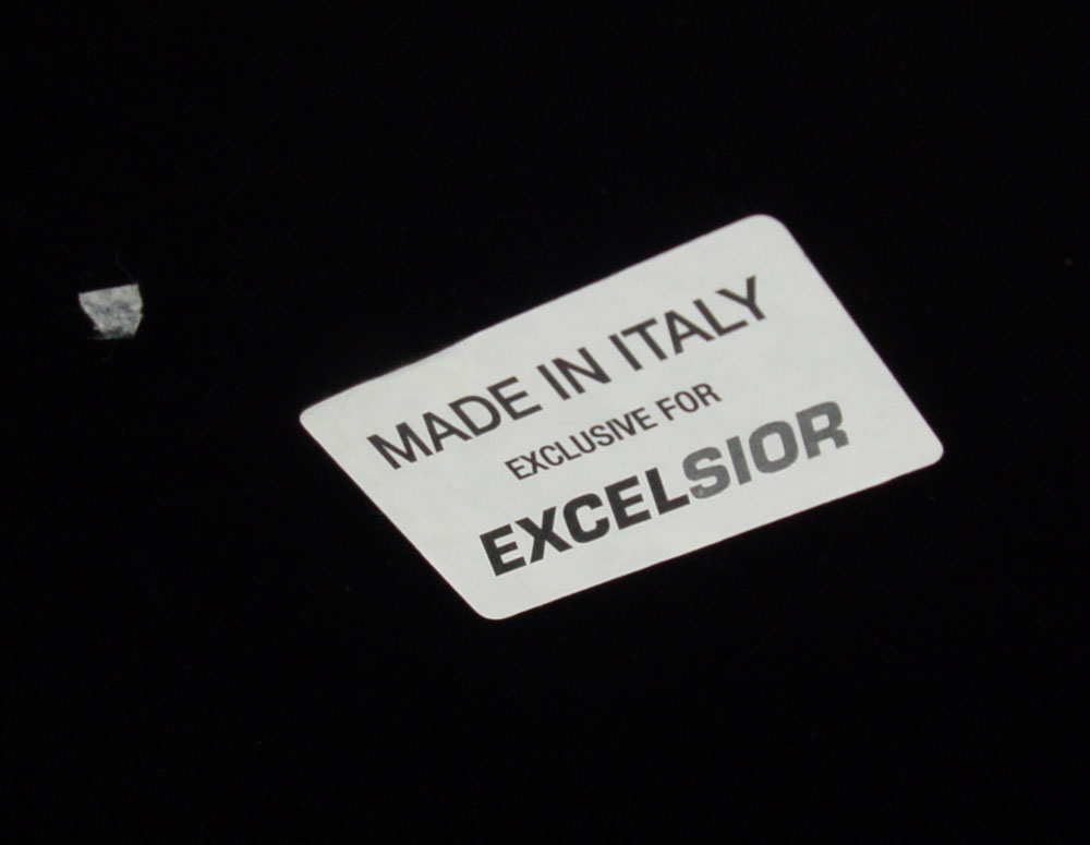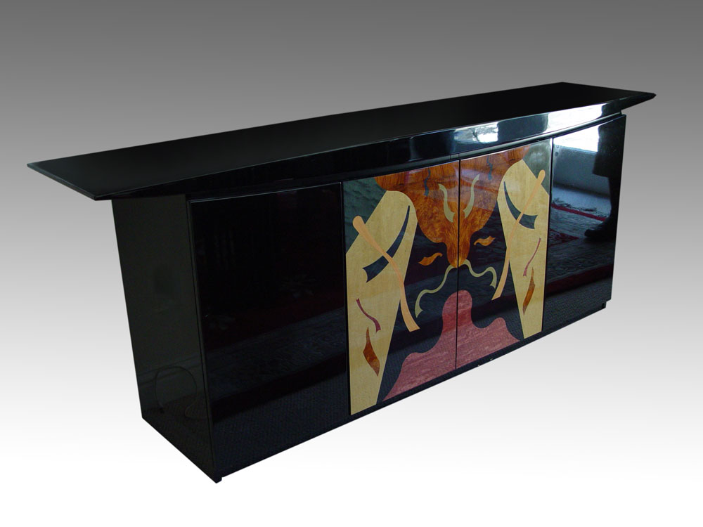 ITALIAN BLACK LACQUER WITH INLAY BUFFET EXCLUSIVELY FOR EXCELSIOR: Four door cabinet with two center doors having match book design, one set opens to shelved interior, the other to single drawer over shelf, 32 3/4''h. x 86 1/2''w. x 19''d.