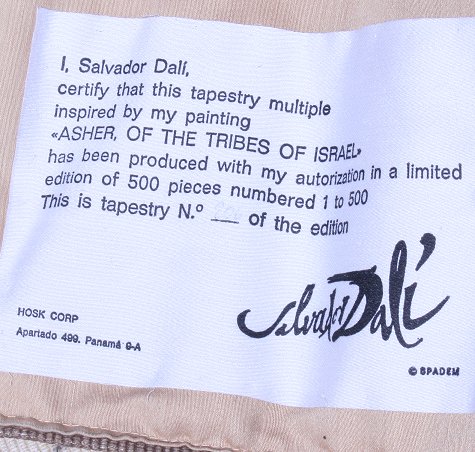 DALI, Salvador, (Spanish, 1904-1989): ''Asher of the Tribes of Israel'', Tapestry, 70'' x 50'', numbered 206/500, original label verso.