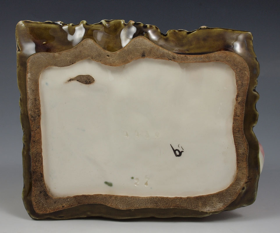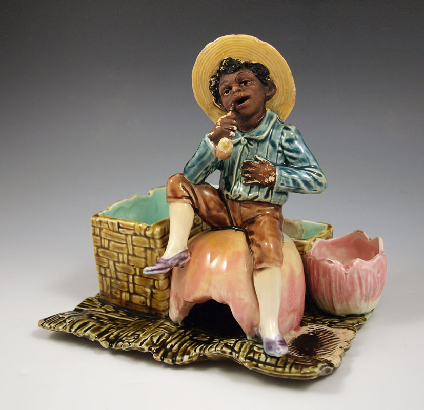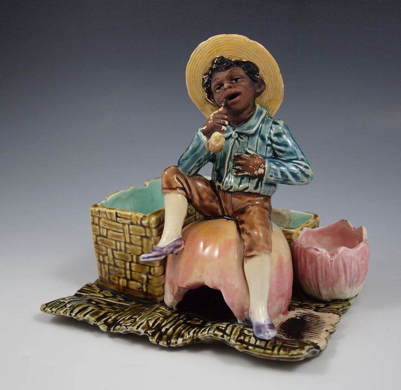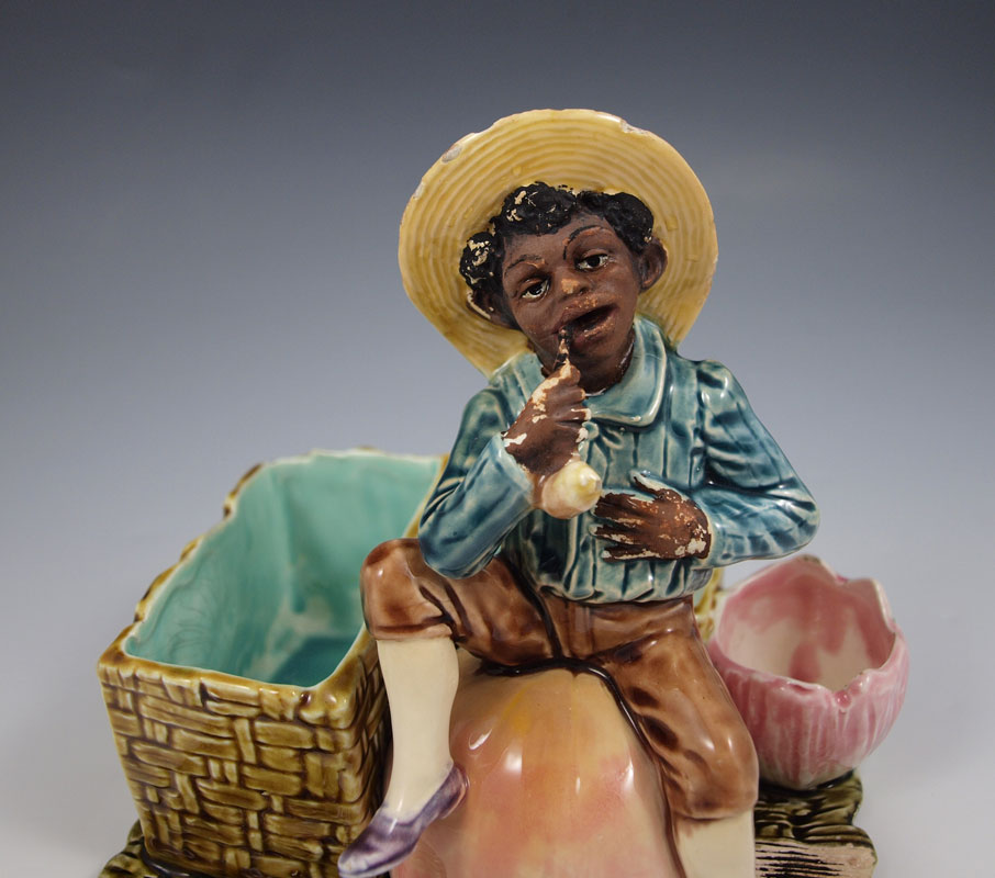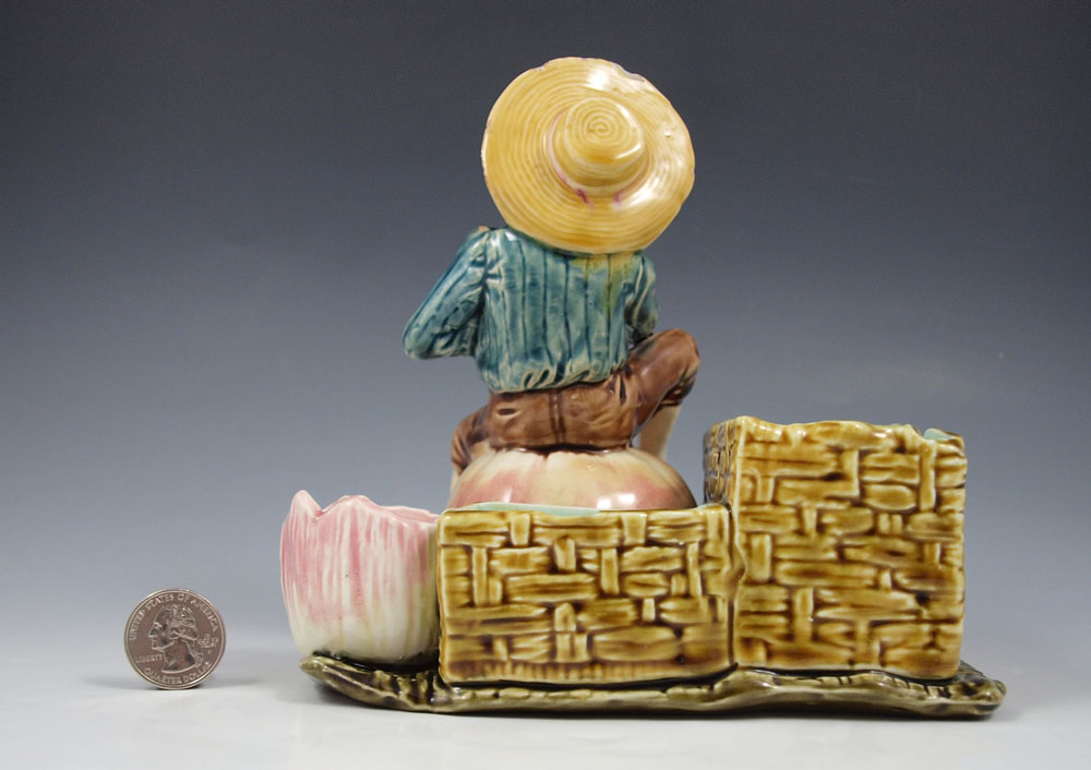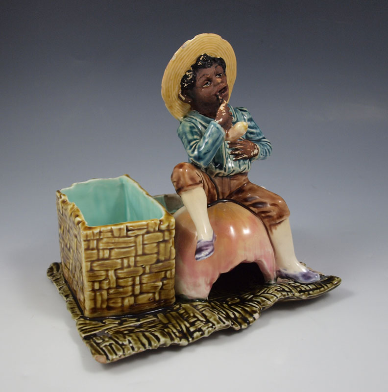 MAJOLICA FIGURAL MATCH HOLDER SMOKE STAND: Man with pipe, striker at his feet. Three compartments. 6 3/4''h. x 6 1/2'' x 5 1/2''.
