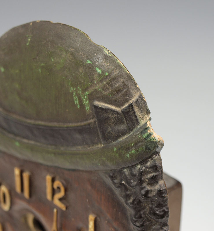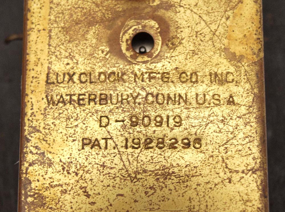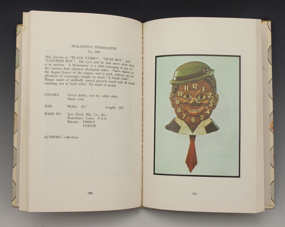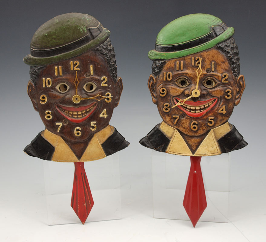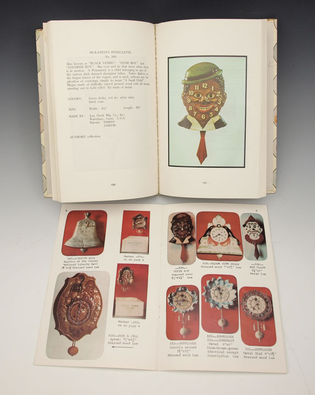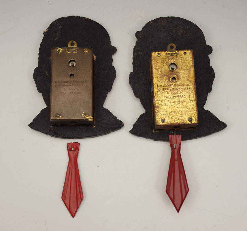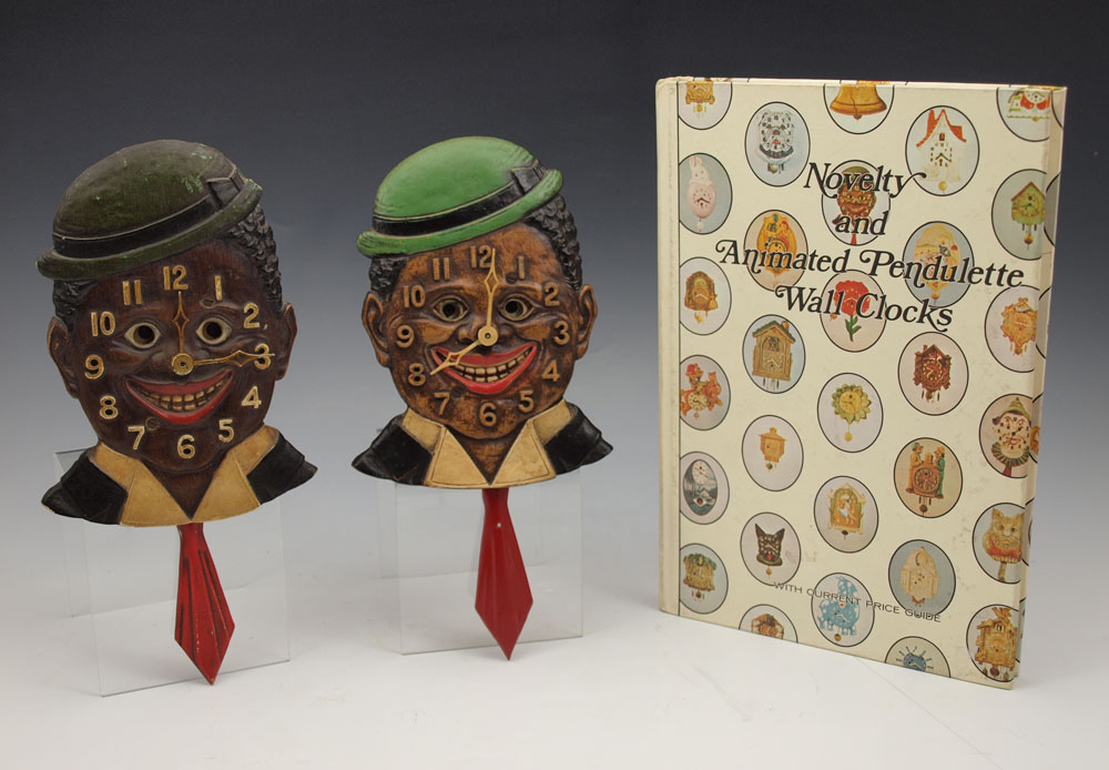 PAIR OF LUX DIXIE BOY PENDULETTE CLOCKS: 2 piece by Lux Clock Mfg, animated pendulette clocks featuring African American with motion eyes and swinging tie. 8 3/4'' h x 4'' x 1 1/2''. Sold with ''Novelty and Animated Pendulette Clocks'' book by Don and Alice Nicholson.