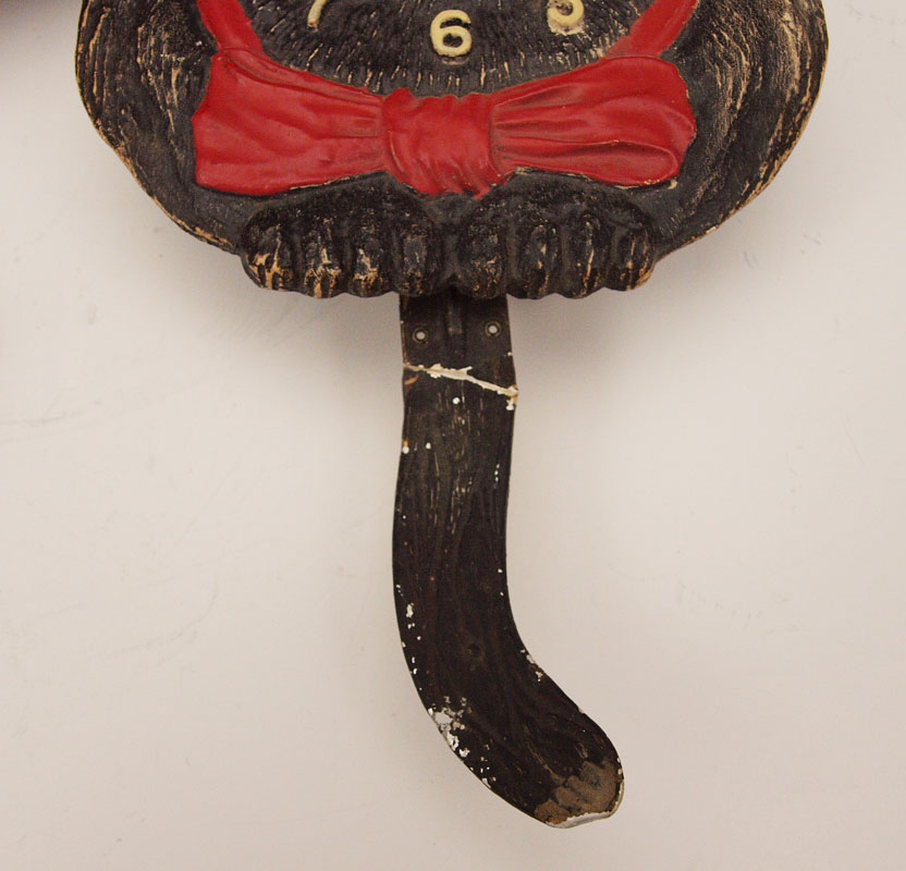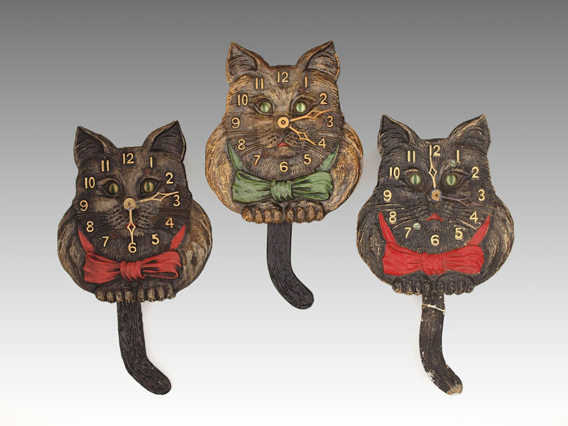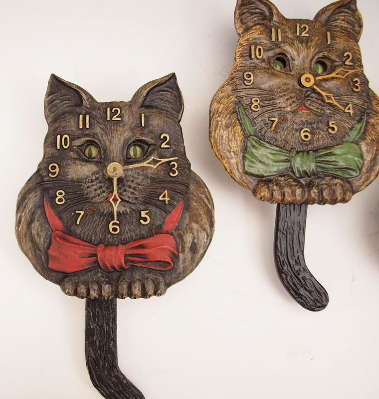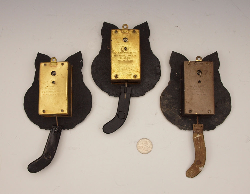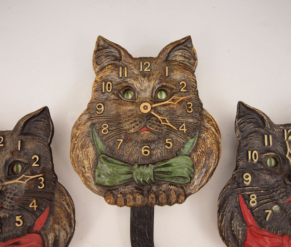 3 WAGGING TAIL CAT LUX PENDULETTE CLOCKS: 2 black with red bow, 1 yellow with green bow by Lux Clock Mfg. Motion eyes and ''wagging'' tail. 7 1/2'' h. x 3 3/4'' x 1 1/2''.