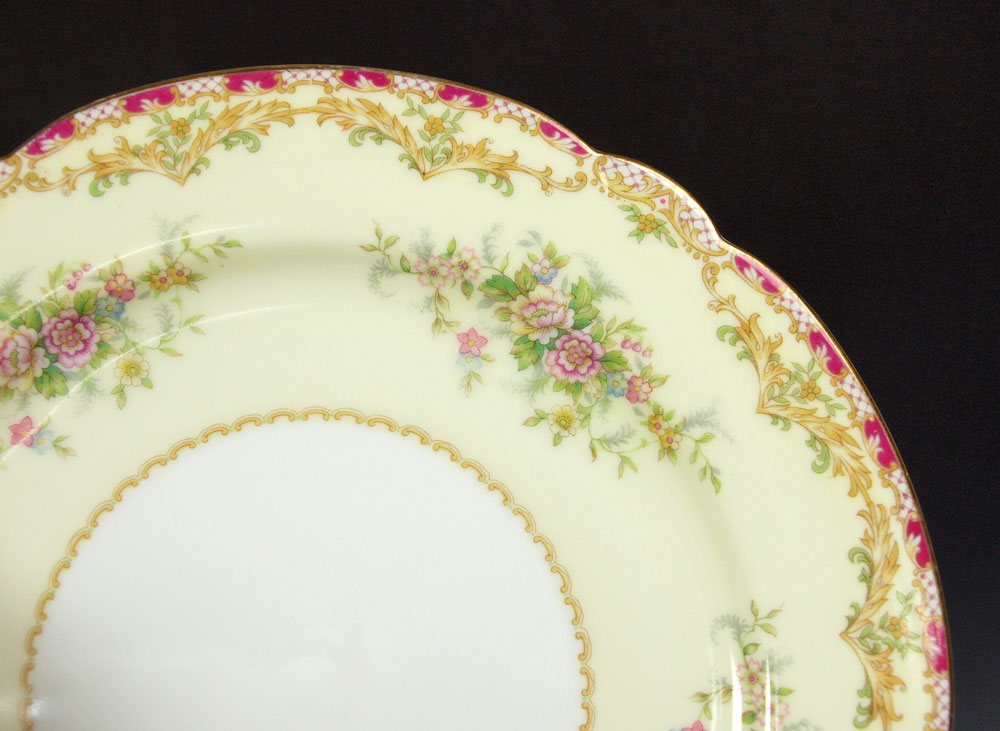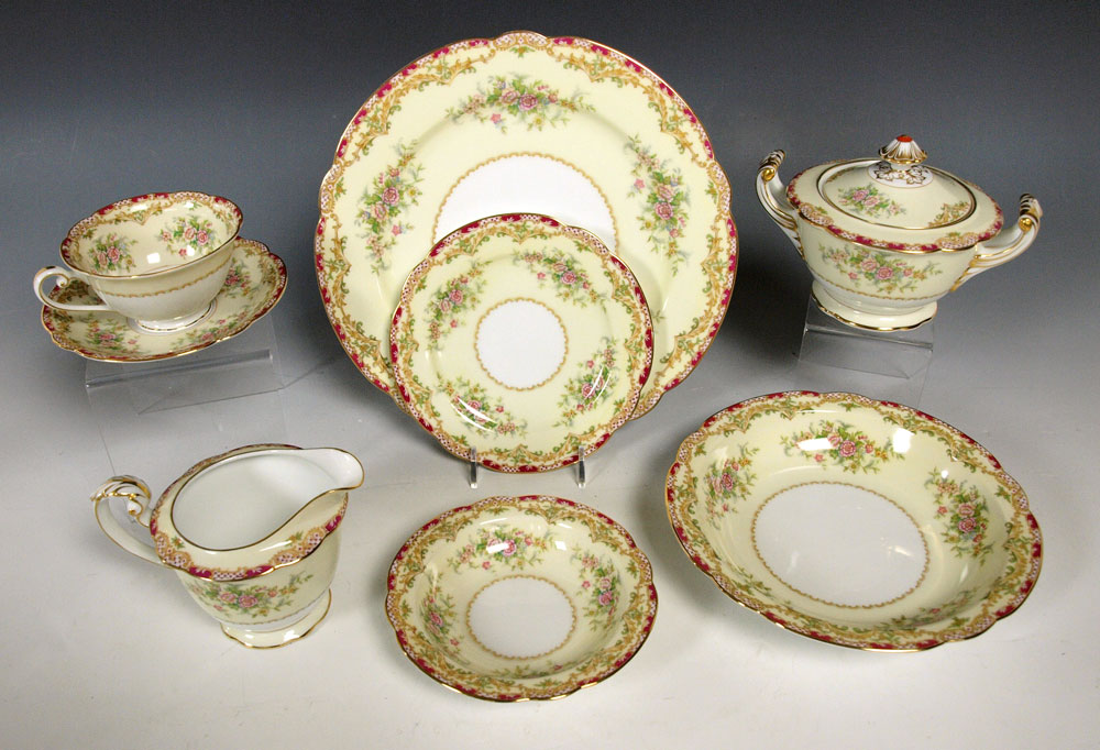 NORITAKE CHINA SERVICE FOR 10 IN THE MALTA CHINA: Approx. 69 pieces to include 12 dinner plates, 11 soup bowls, 12 salad plates, 12 bread, 12 dessert bowls, 10 cups, 12 saucers, and the sugar and creamer.