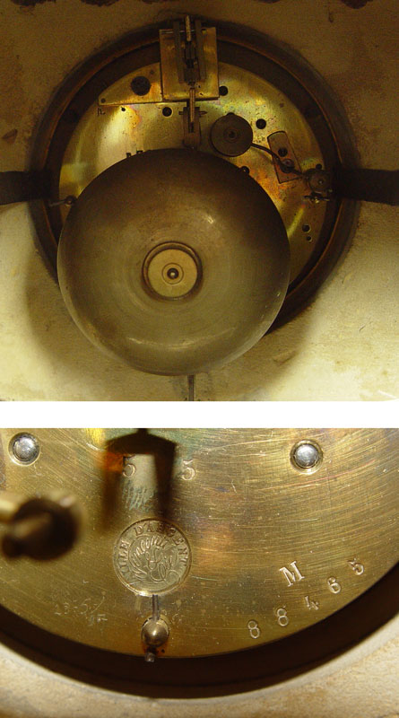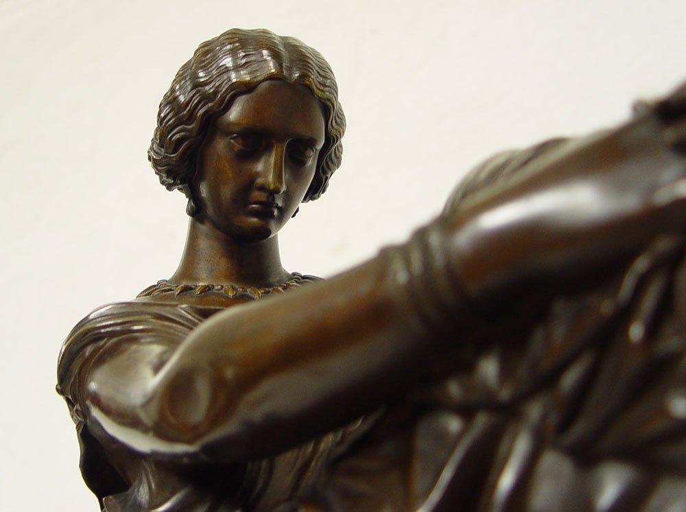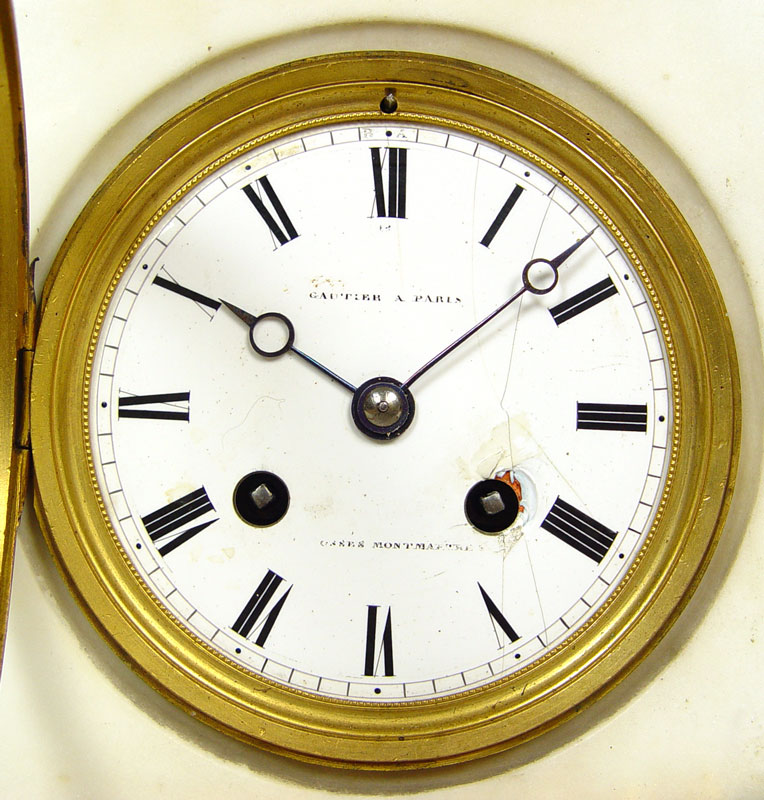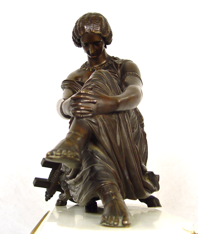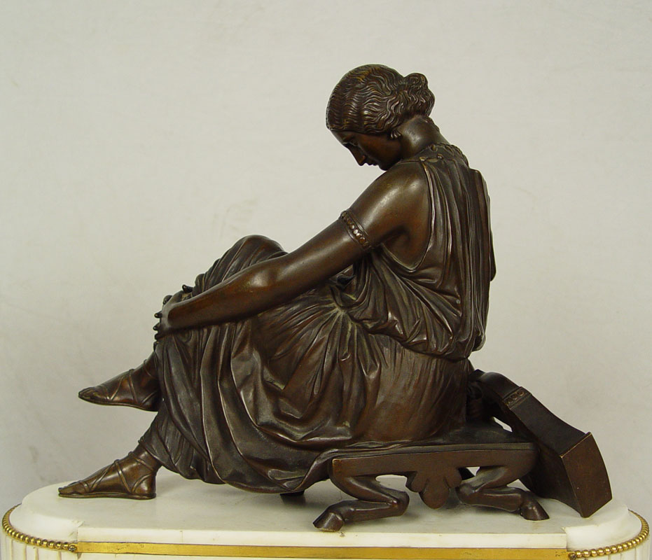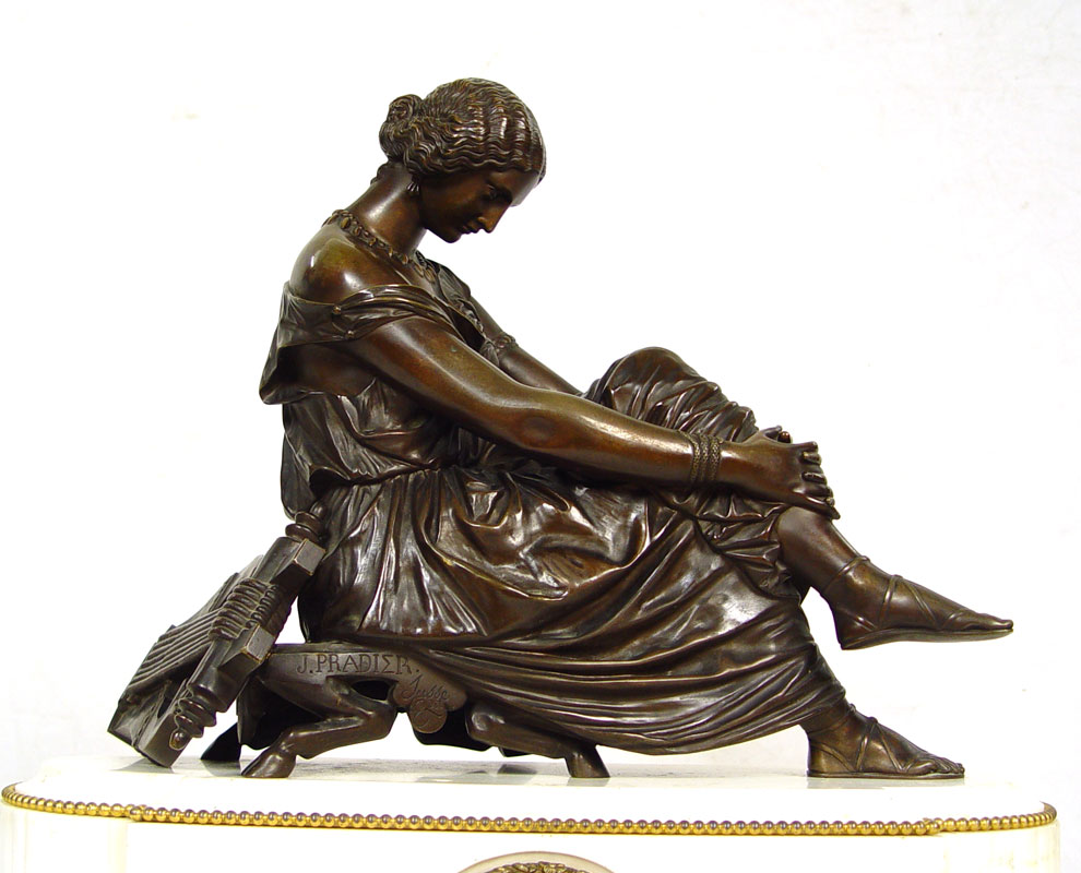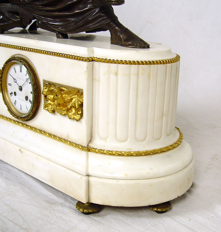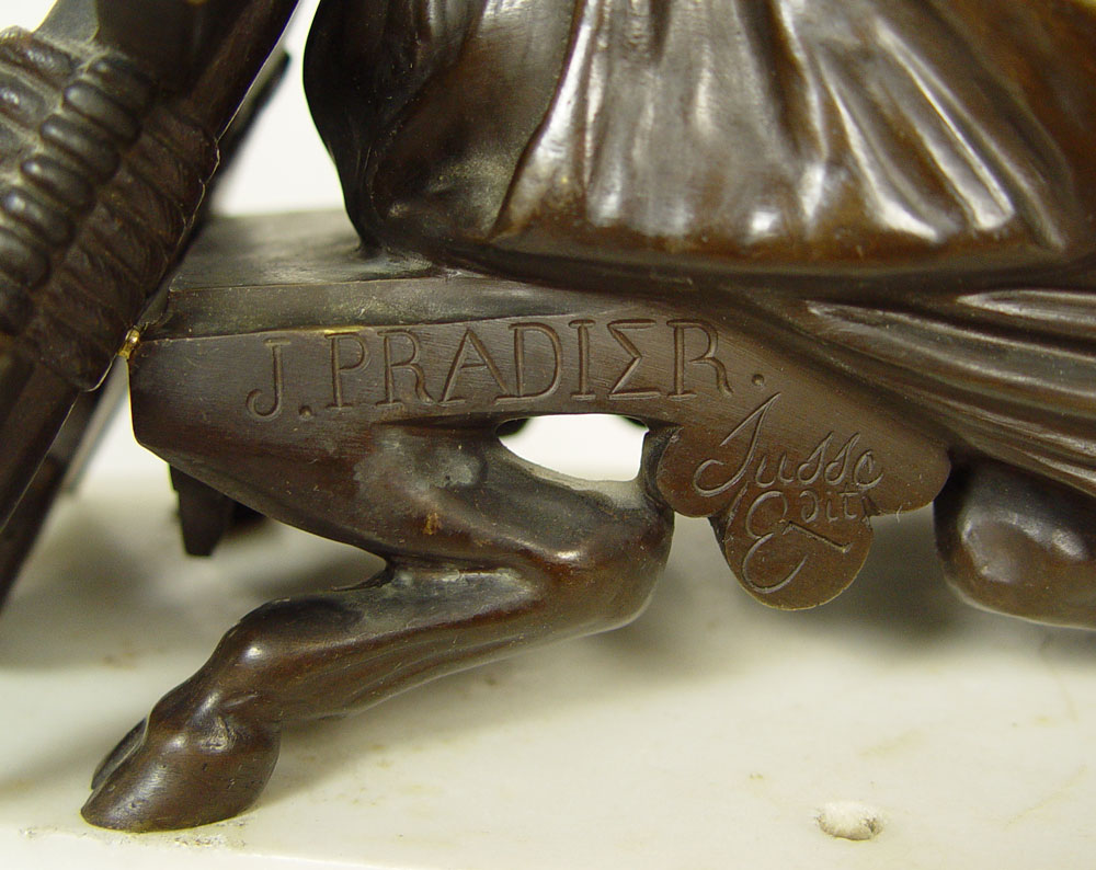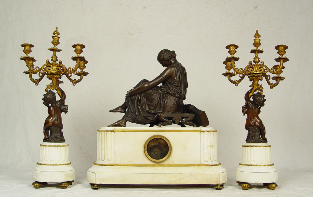 GATIER A PARIS FRENCH BRONZE CLOCK GARNITURE: White marble & ormolu base with figural bronze woman seated. ''The Seated Sappho'' bronze signed J. Pradier, Susse Edit. Enameled face marked Gatier A Paris, Cases Montmarthe?. Vicente Et Cie key and pendulum movement. 24'' h. x 23 1/2'' x 9''. Sold with pair of 5 light candelabra with figural cherubs with matching bases, 27'' x 12''. Key & pendulum in office.