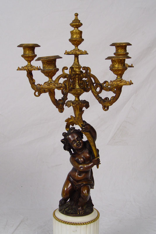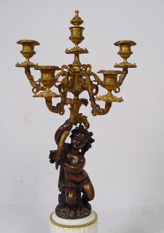 CONDITION: Note chips to face. Each candelabrum at one time having five lights, now with four. Sold with extra arm and may be reattached as desired.